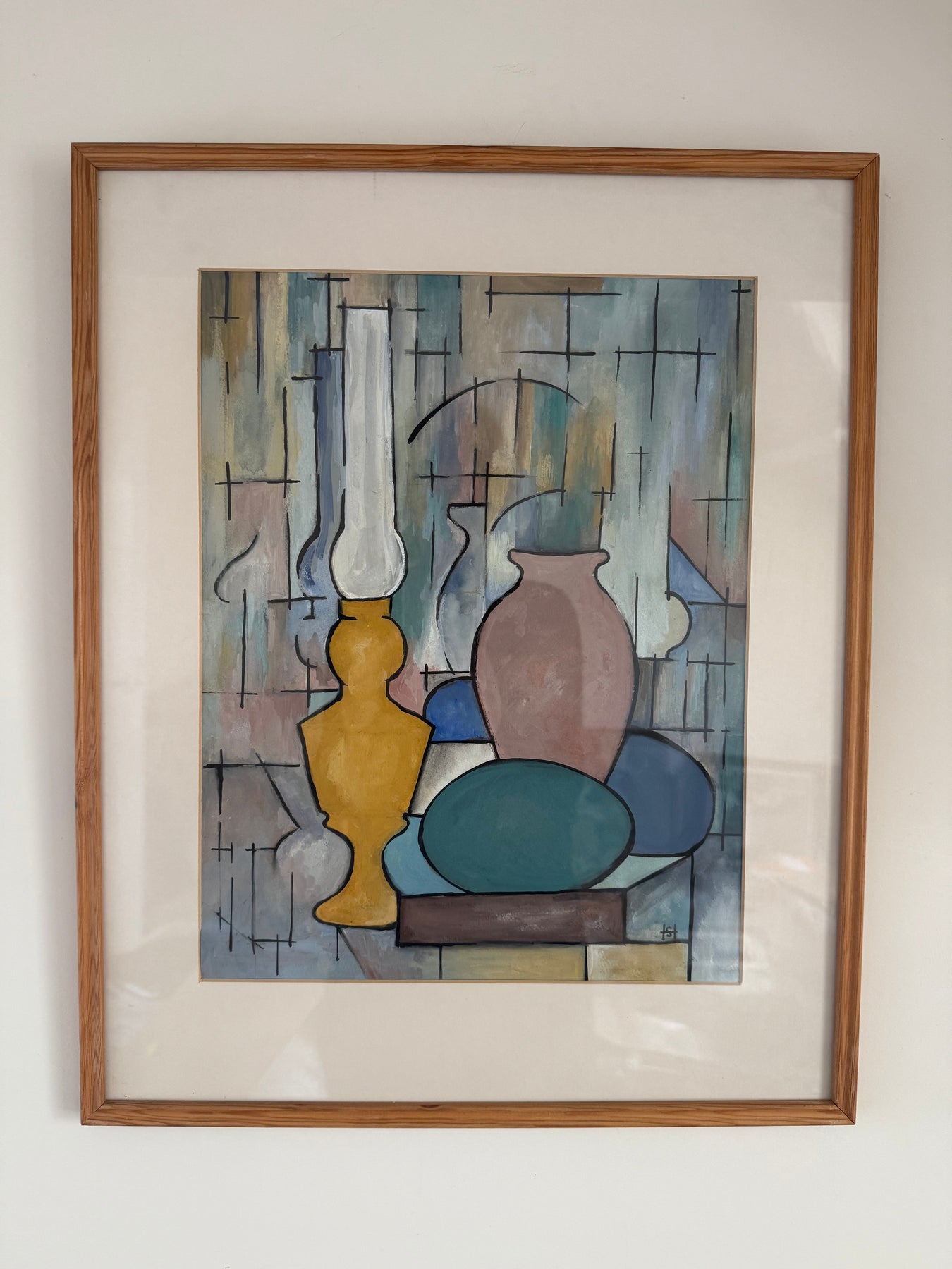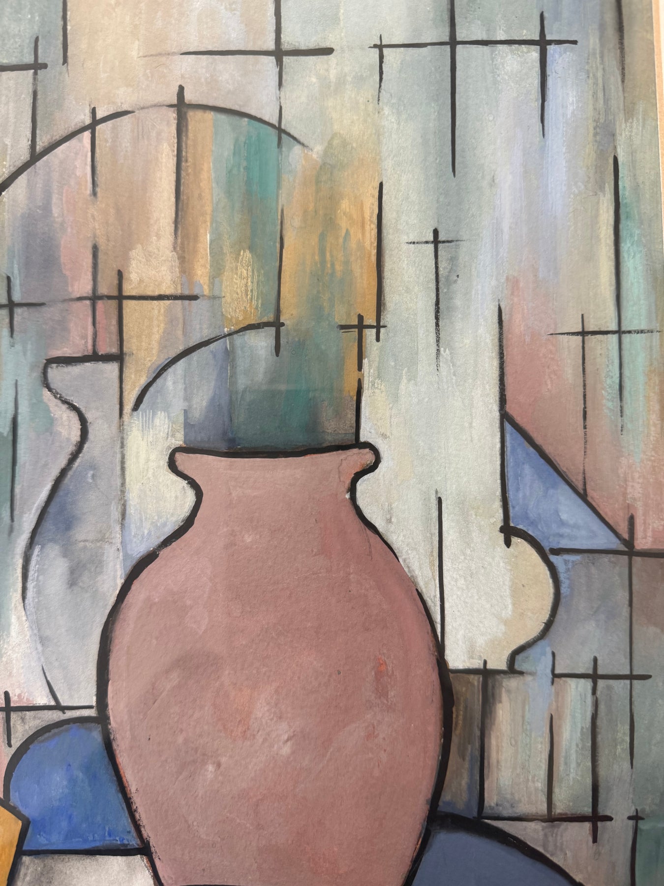 A geometric still-life arrangement of vases and vessels combining cubist abstraction with a mid-century aesthetic.