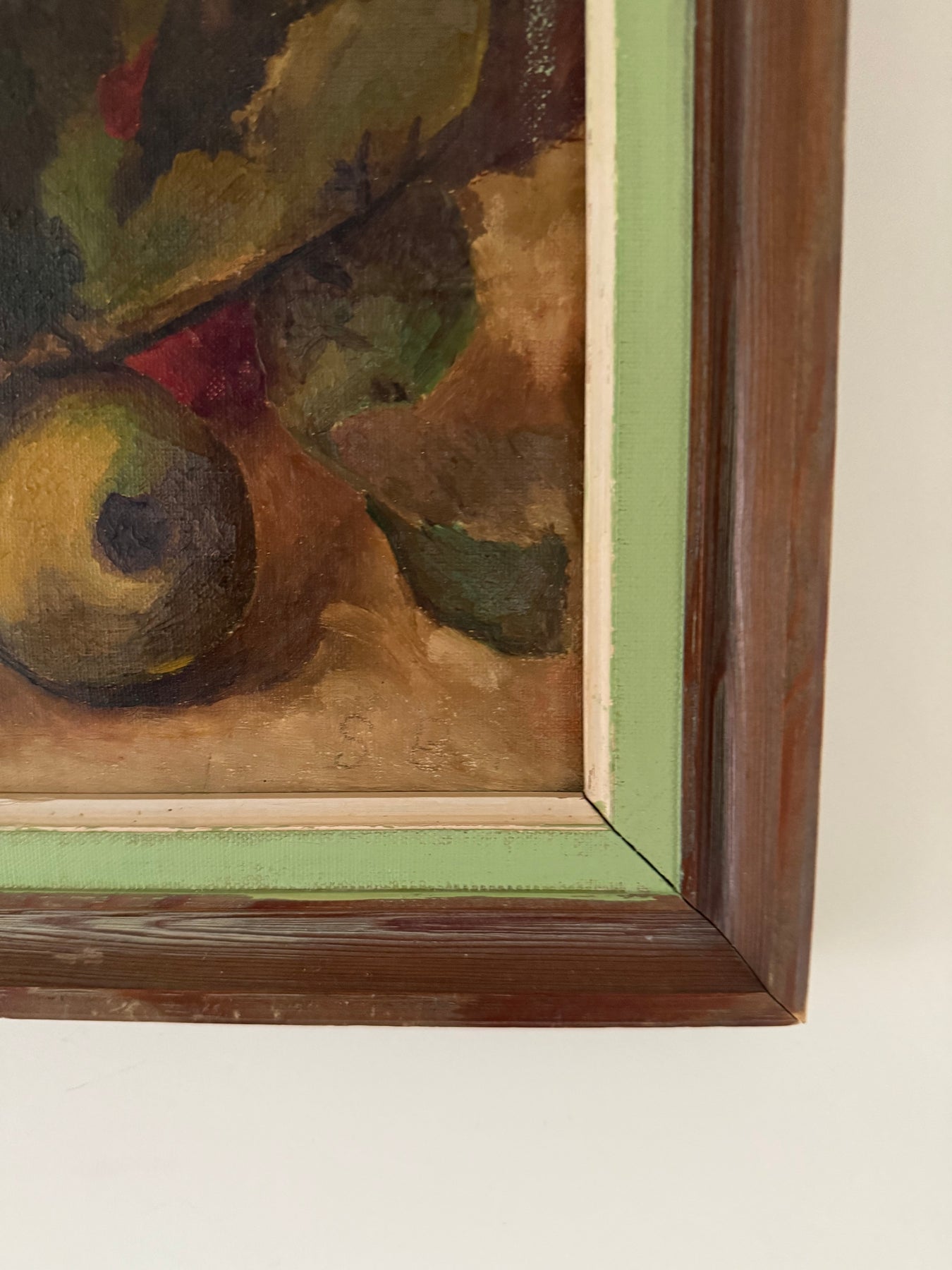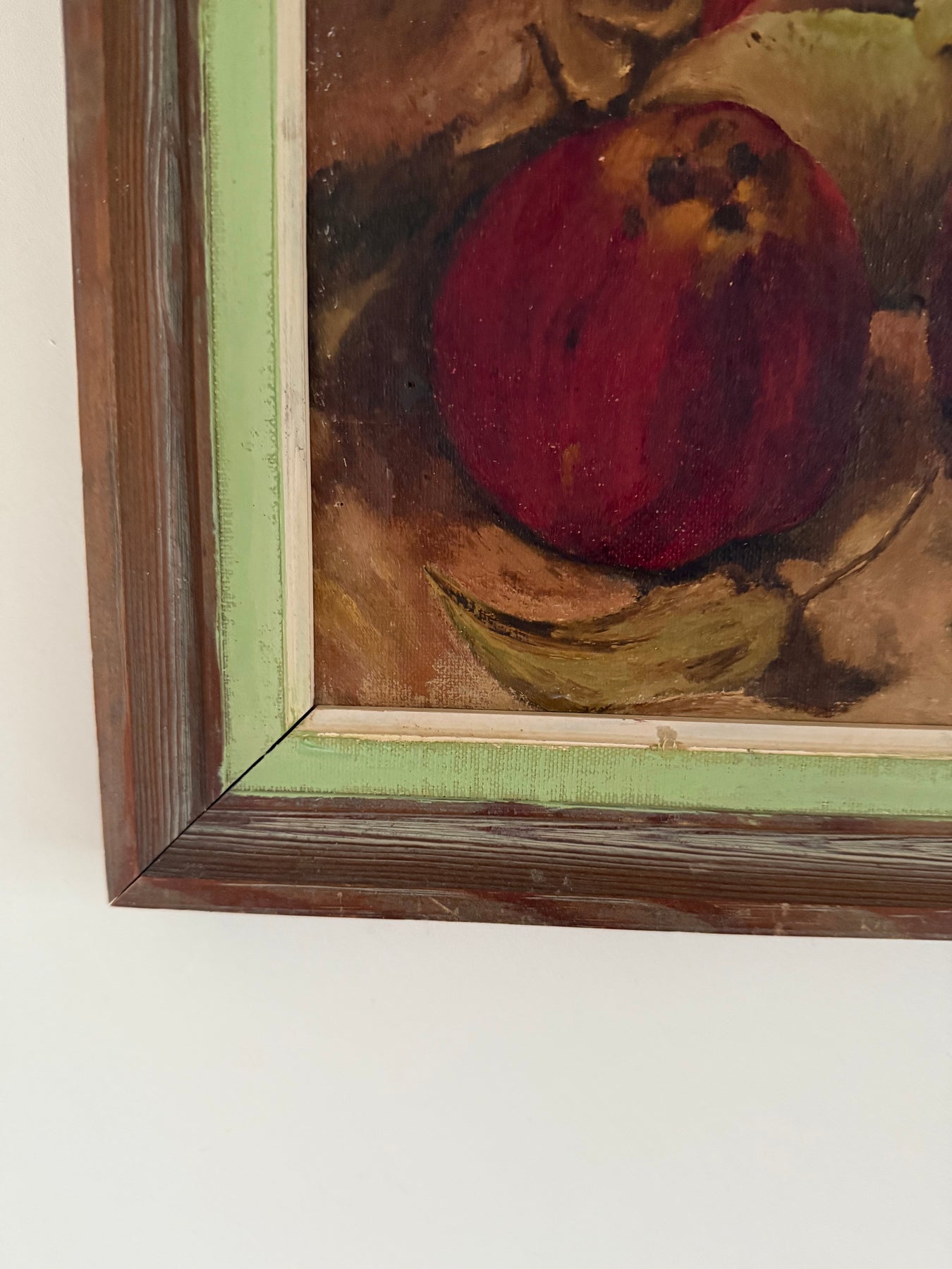 A mid-century still life oil painting depicting a grouped arrangement of apples, pears, and scattered leaves on a neutral ground. The composition uses warm red, green, and yellow tones against a dark brown backdrop. Painted with loose, visible brushstrokes and soft edges typical of mid-20th-century decorative still life work.