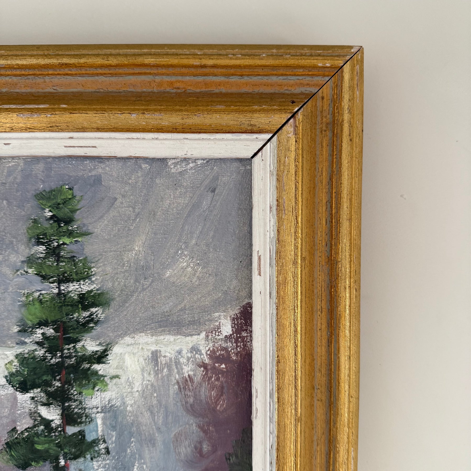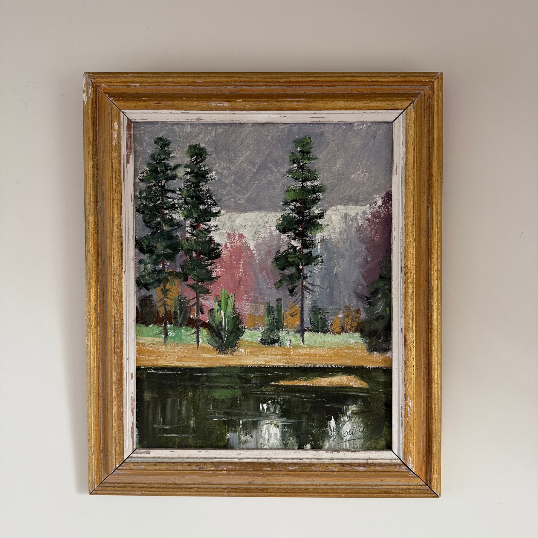 Vintage oil on canvas of pine trees in a mountainous landscape.