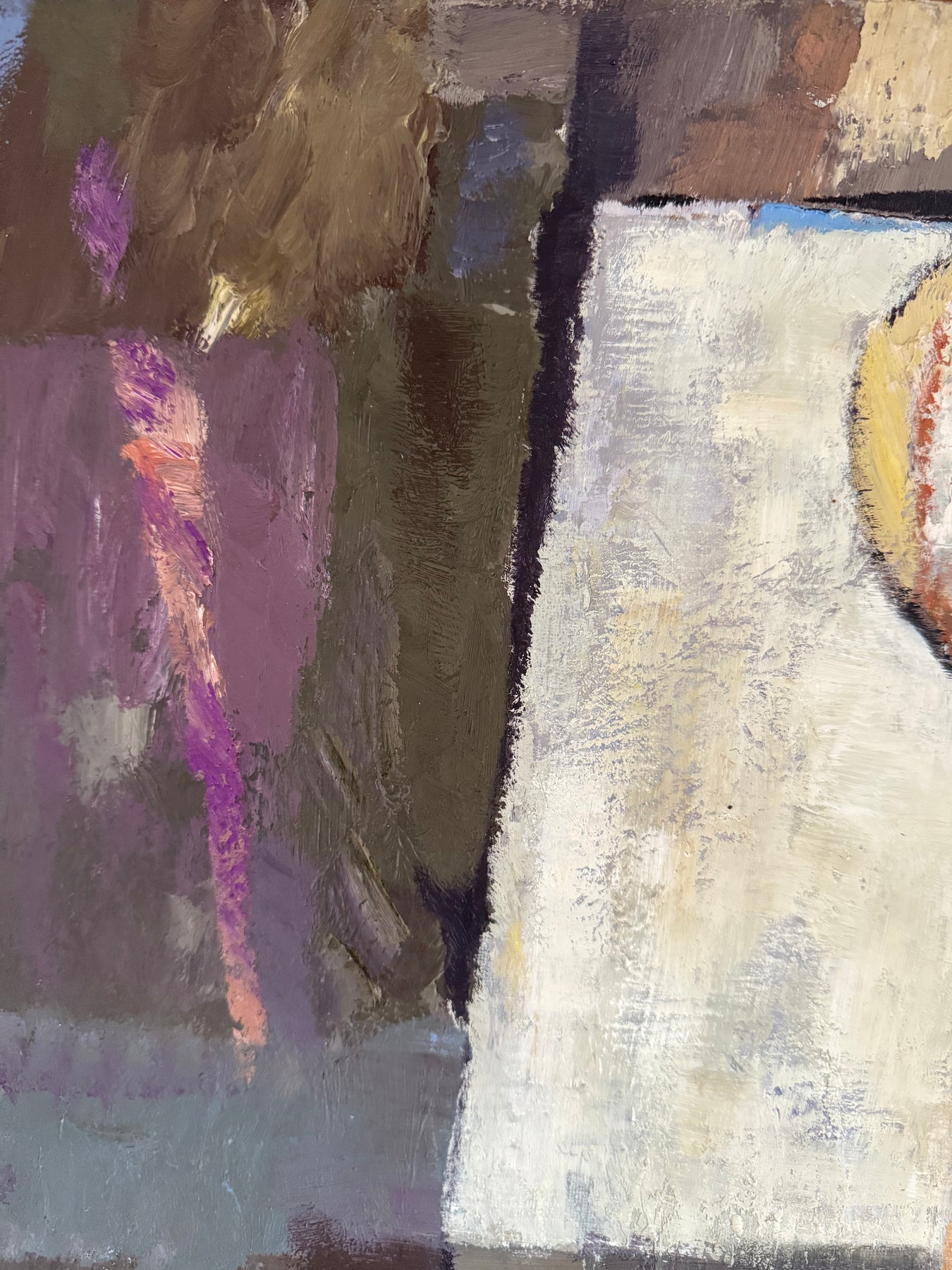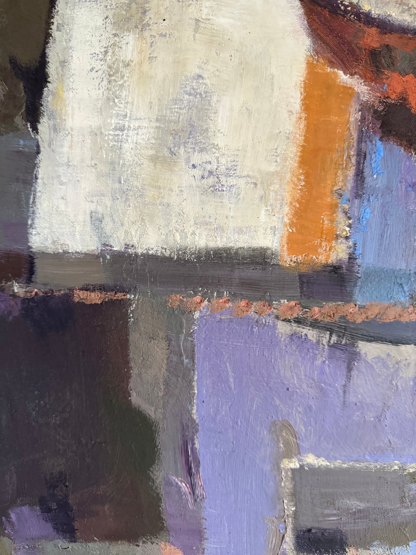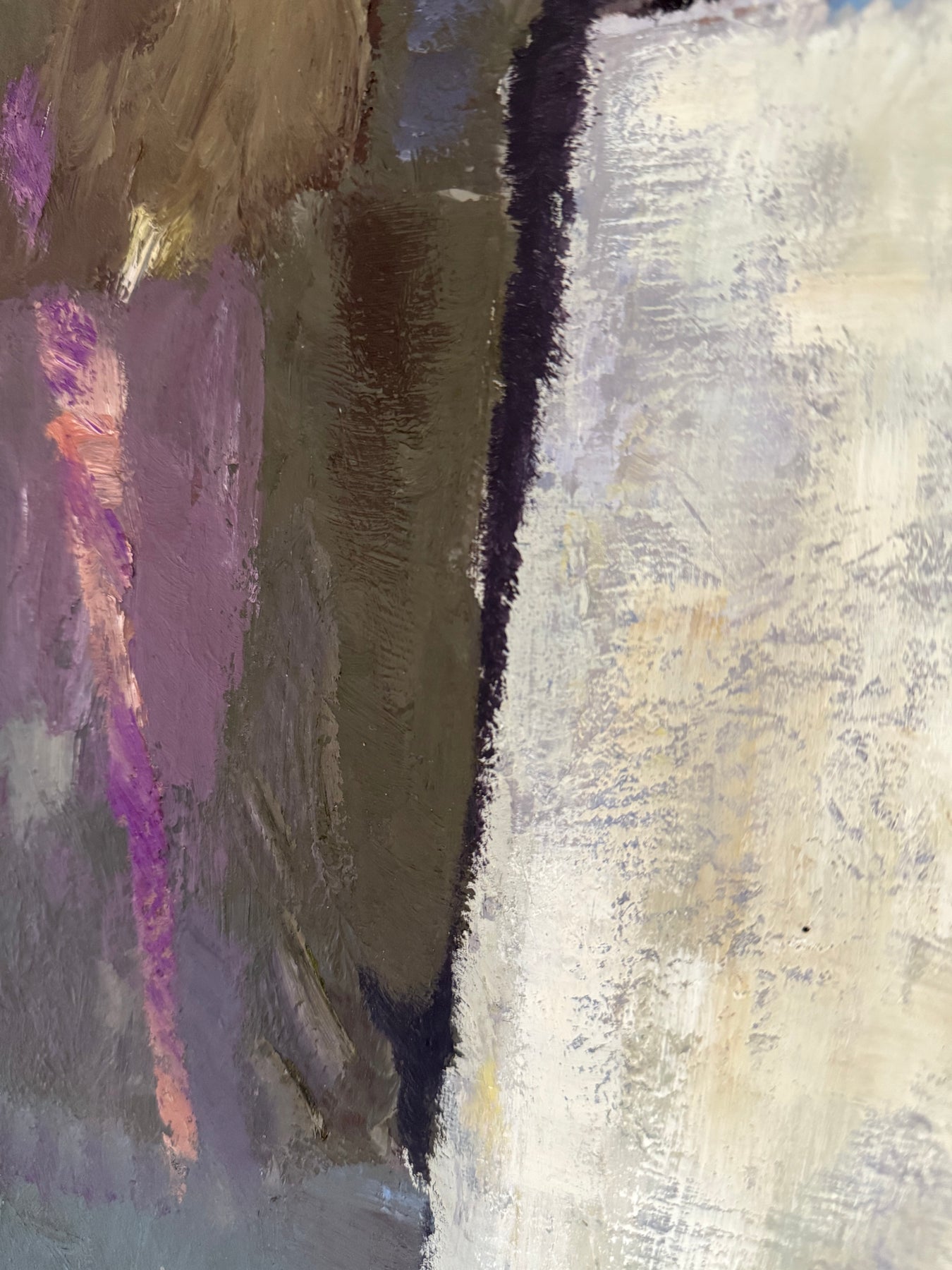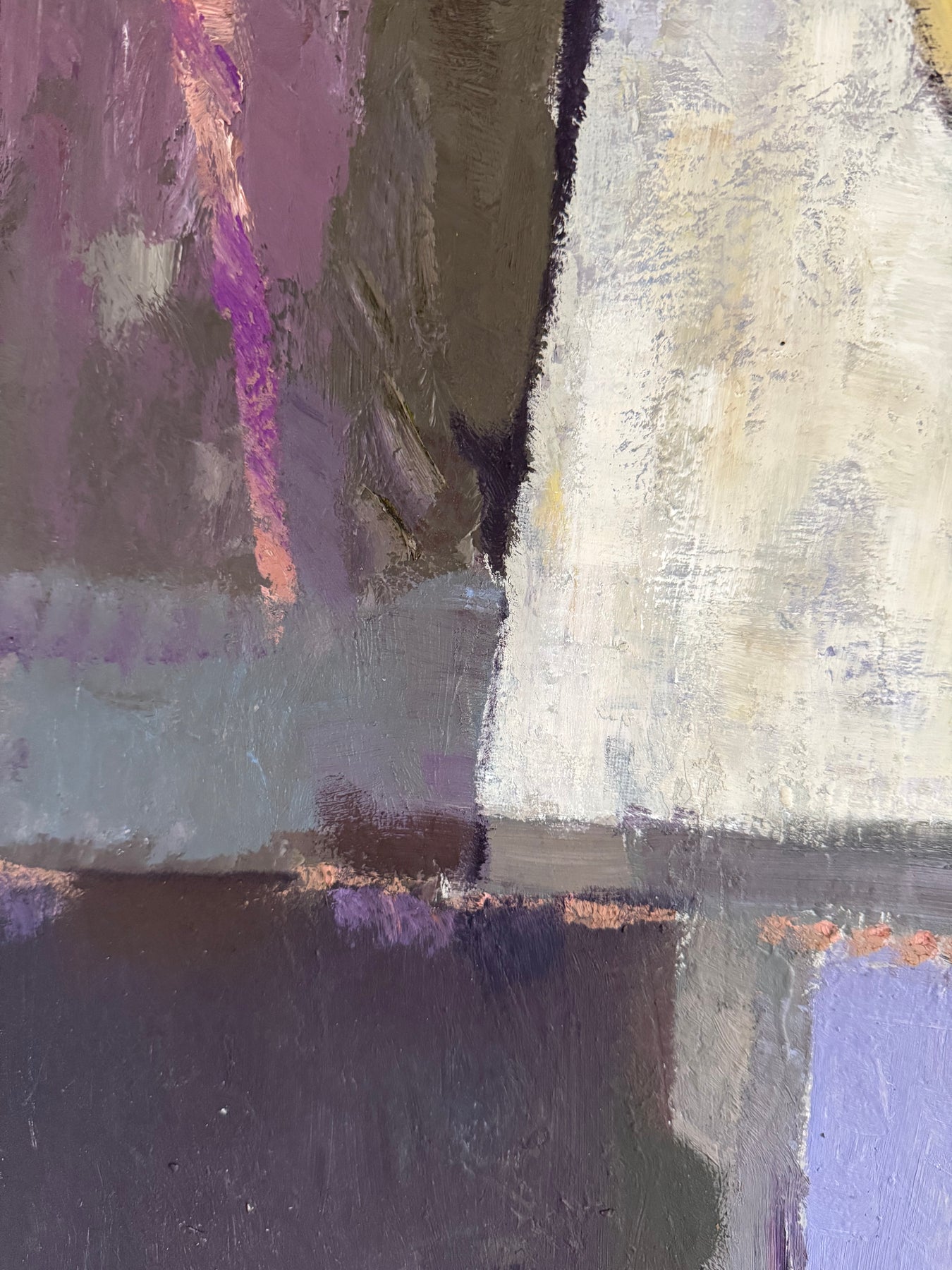 The palette is restrained, combining purples, greys and earth tones with areas of lighter contrast. Paint is applied directly, with visible brushwork and surface texture contributing to the overall composition.