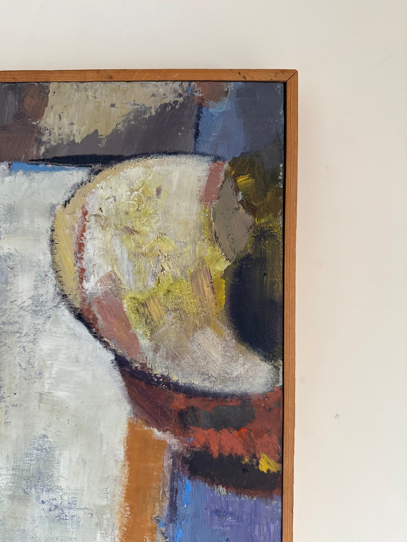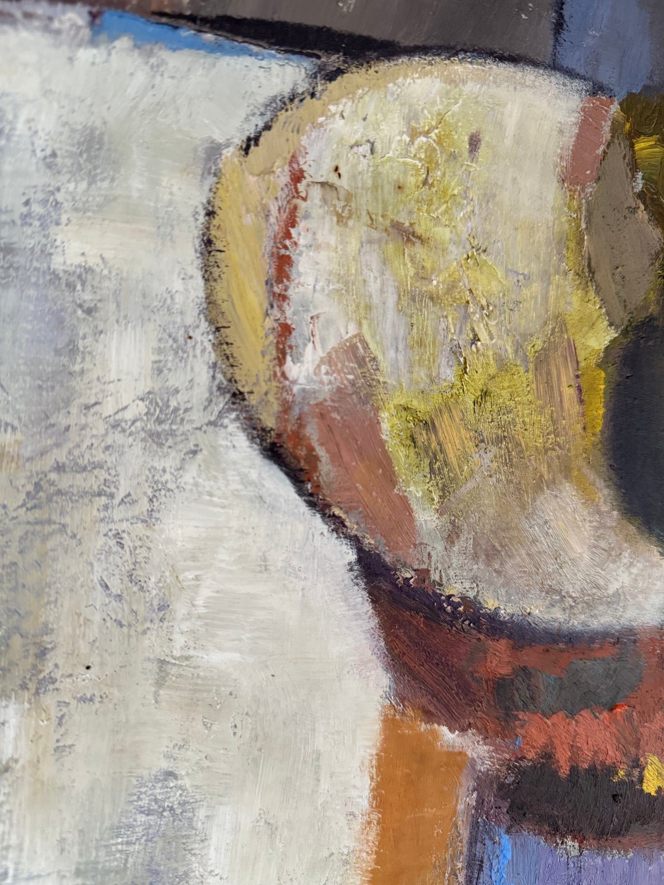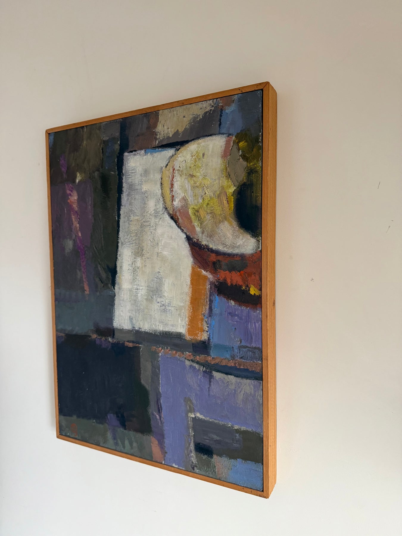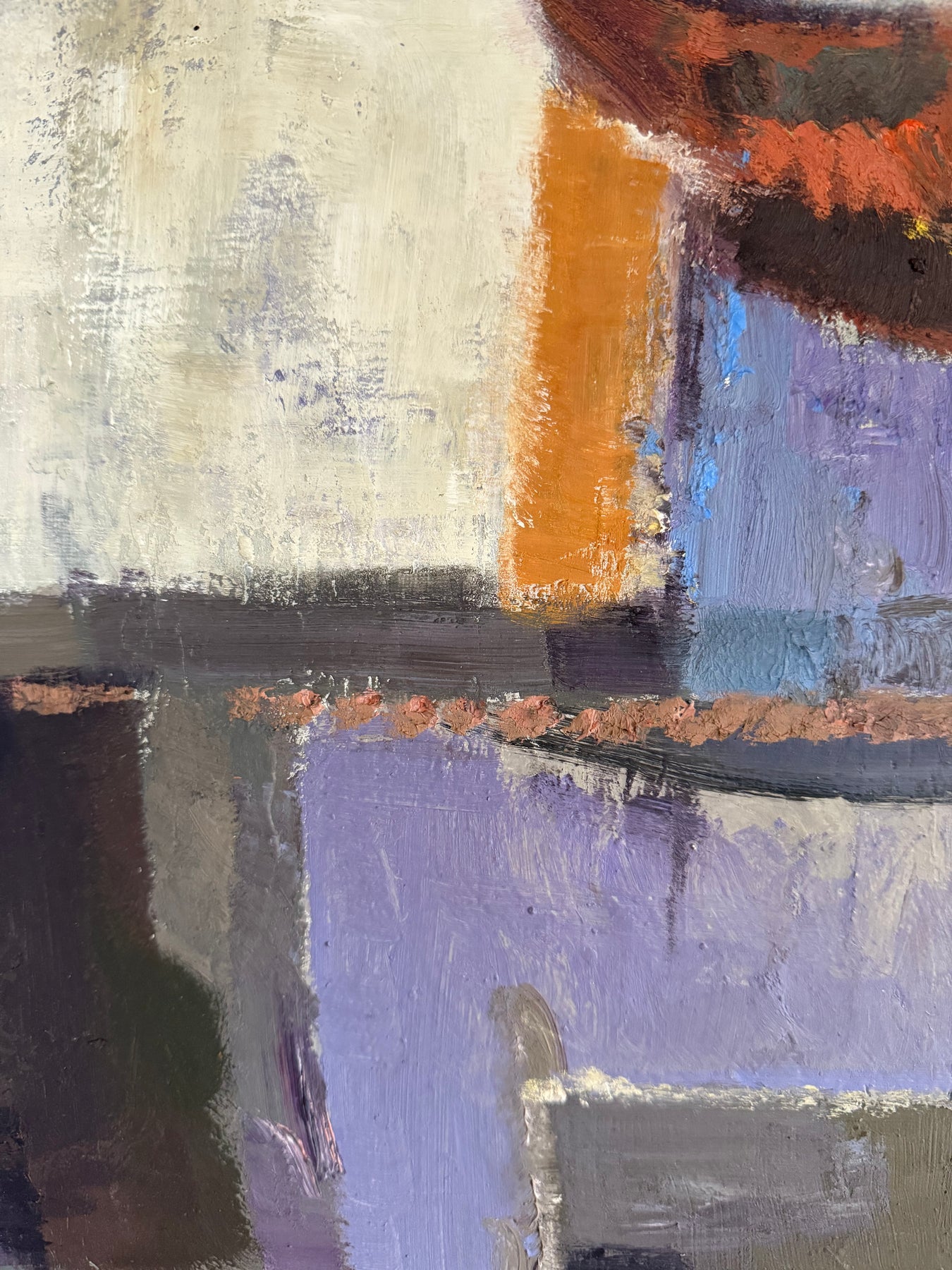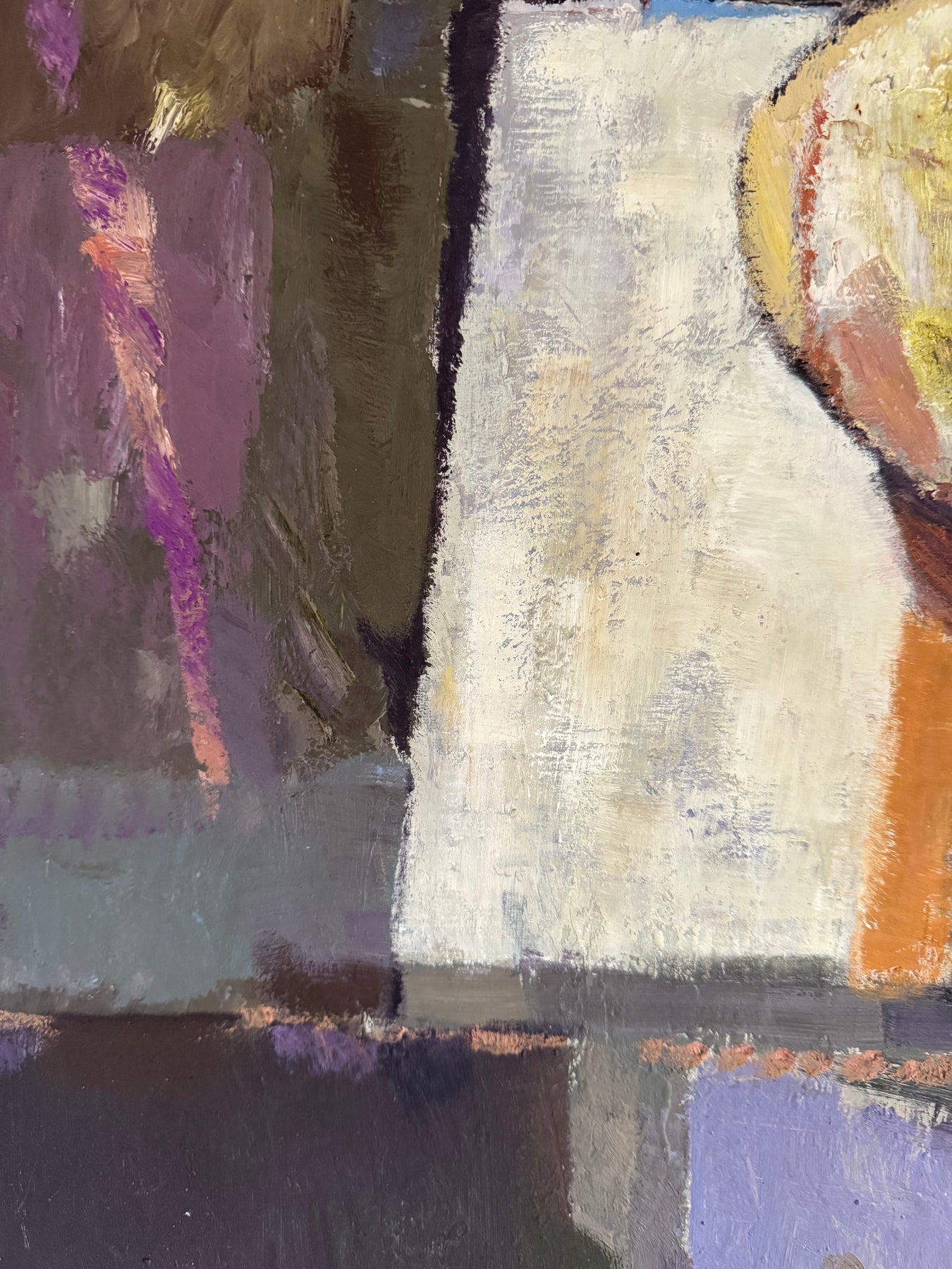 The palette is restrained, combining purples, greys and earth tones with areas of lighter contrast. Paint is applied directly, with visible brushwork and surface texture contributing to the overall composition.