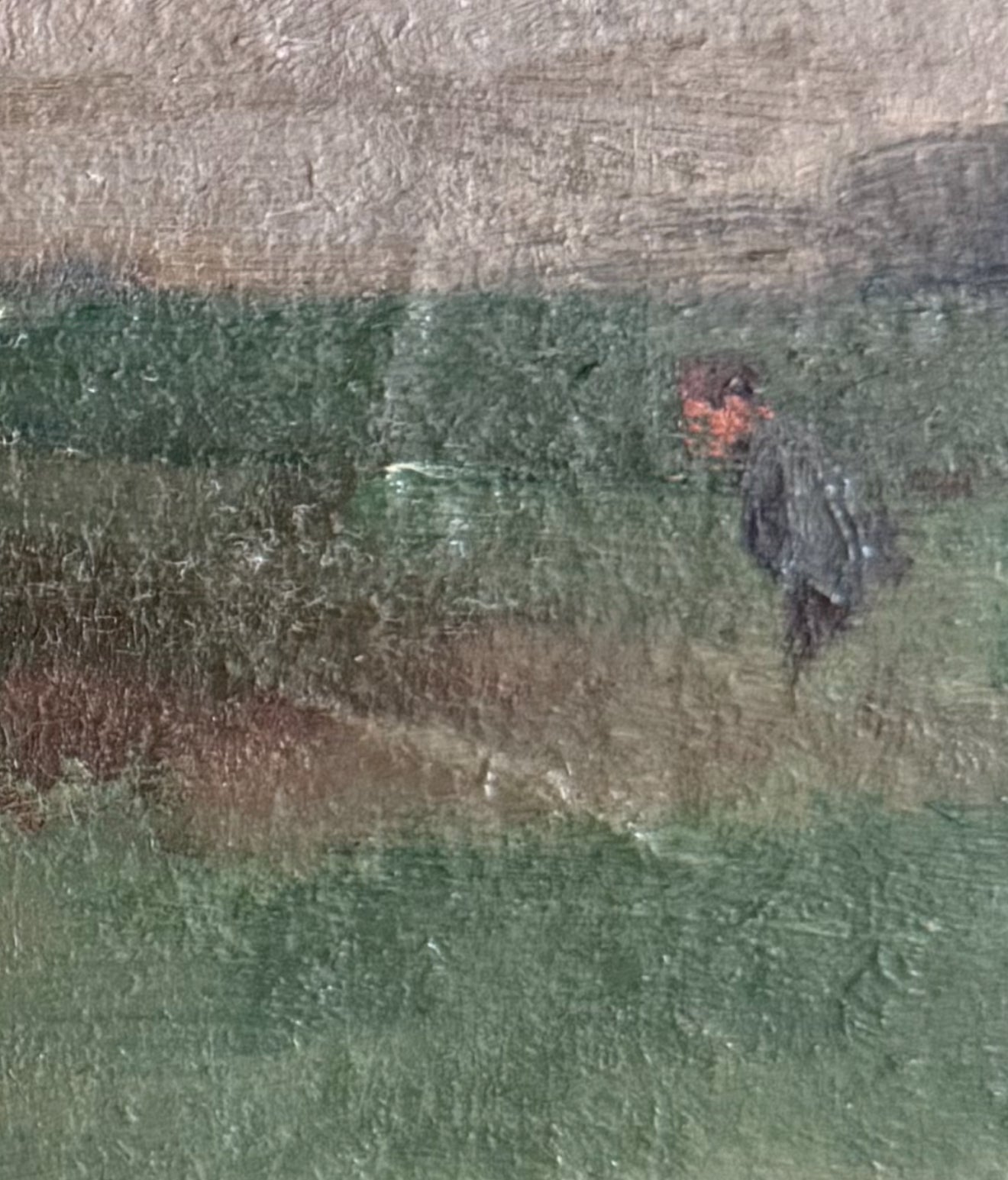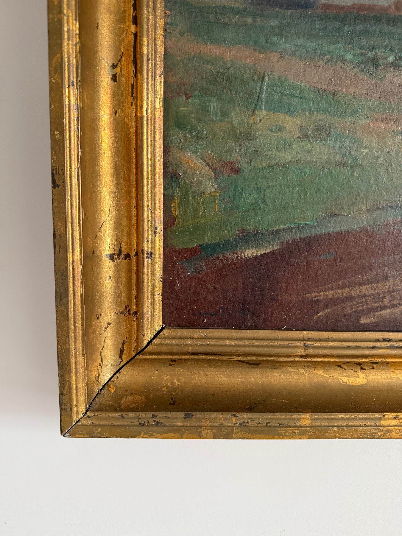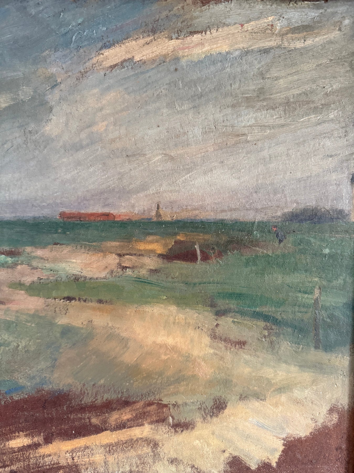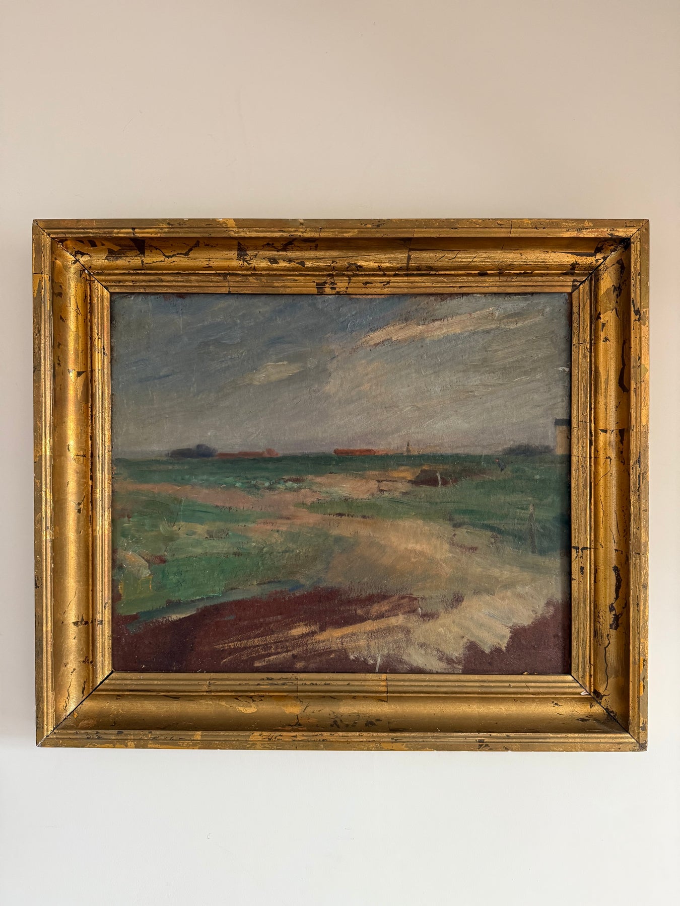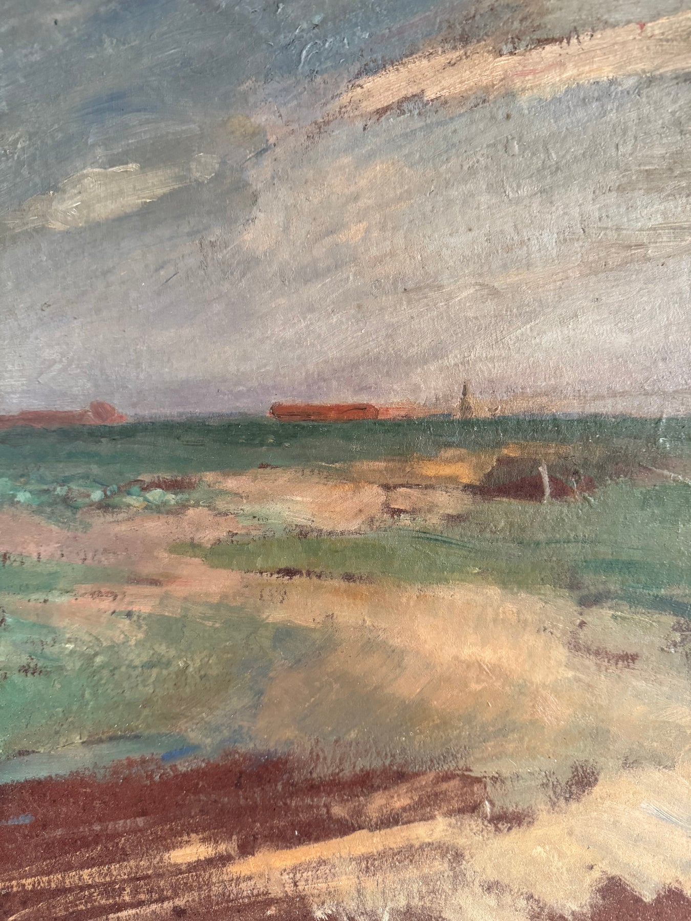 The colour palette is restrained, using muted greens, earth tones and soft greys. Paint is applied directly, with visible brush marks across the surface. The work reflects an early 20th-century approach to landscape painting that prioritises atmosphere and structure over detailed description.