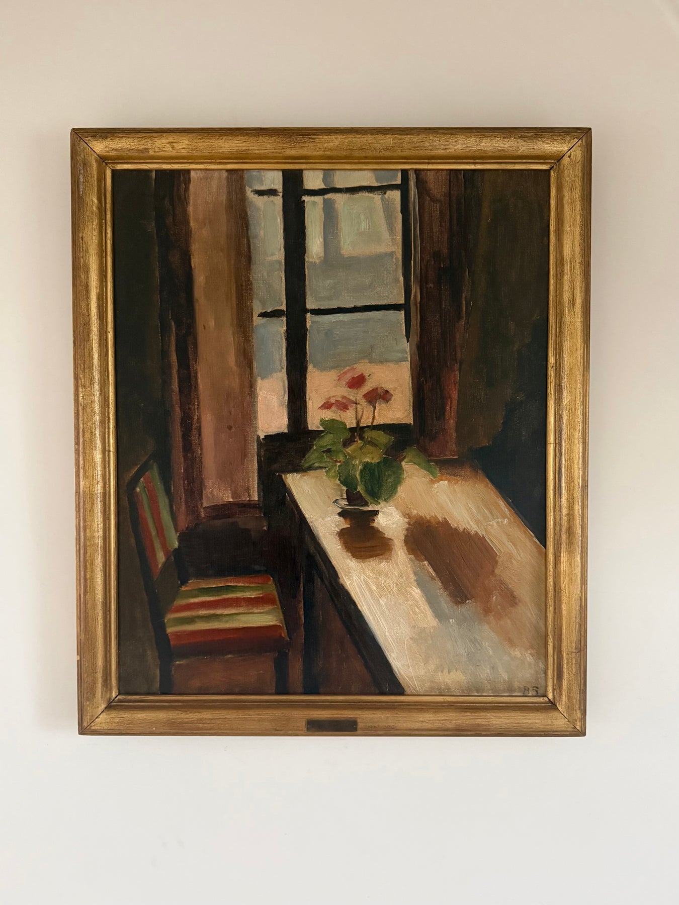 A quietly atmospheric interior by Swedish painter Birger Simonsson, depicting a table set before a tall window, a small cyclamen in bloom catching the soft northern light.