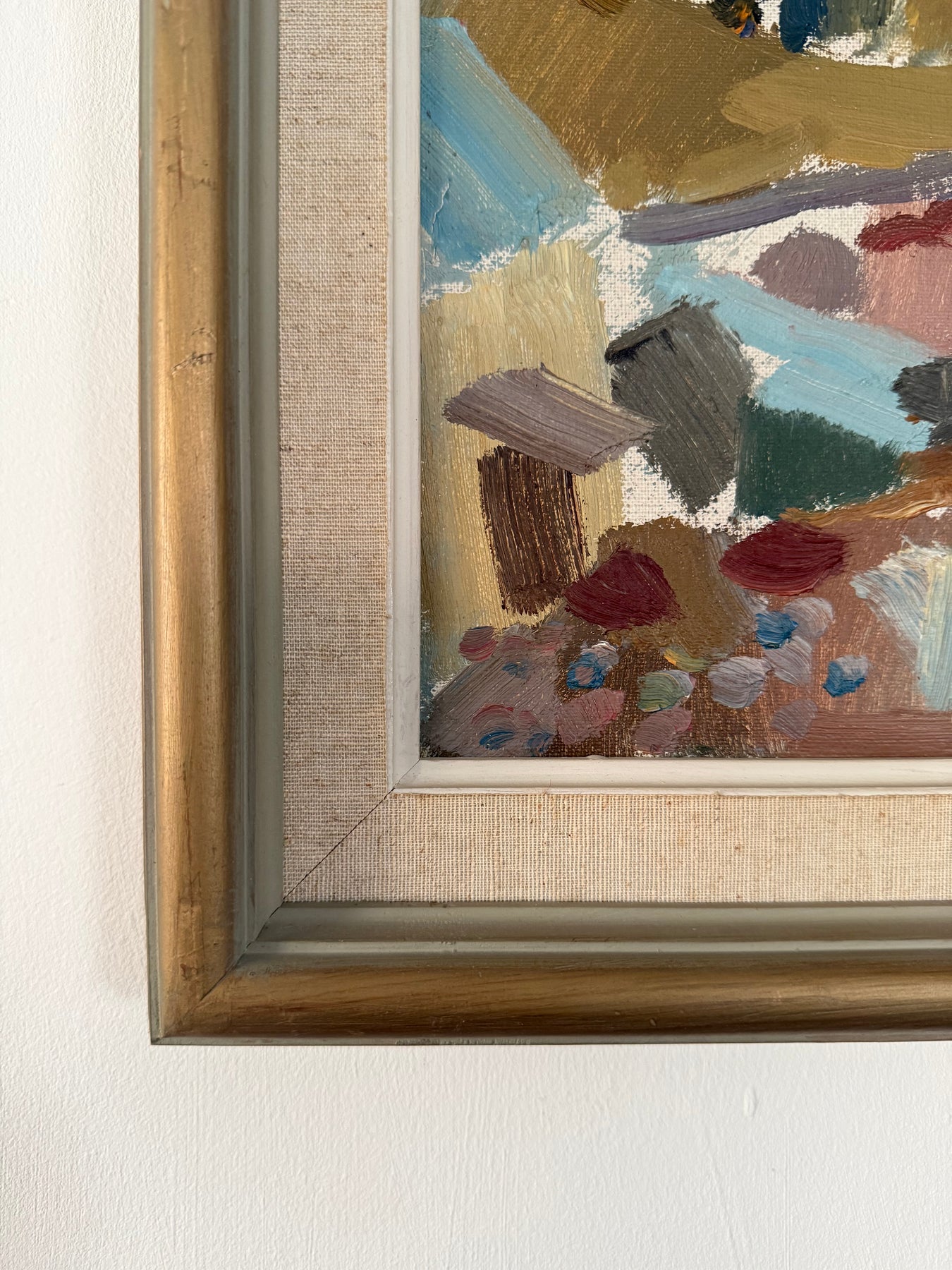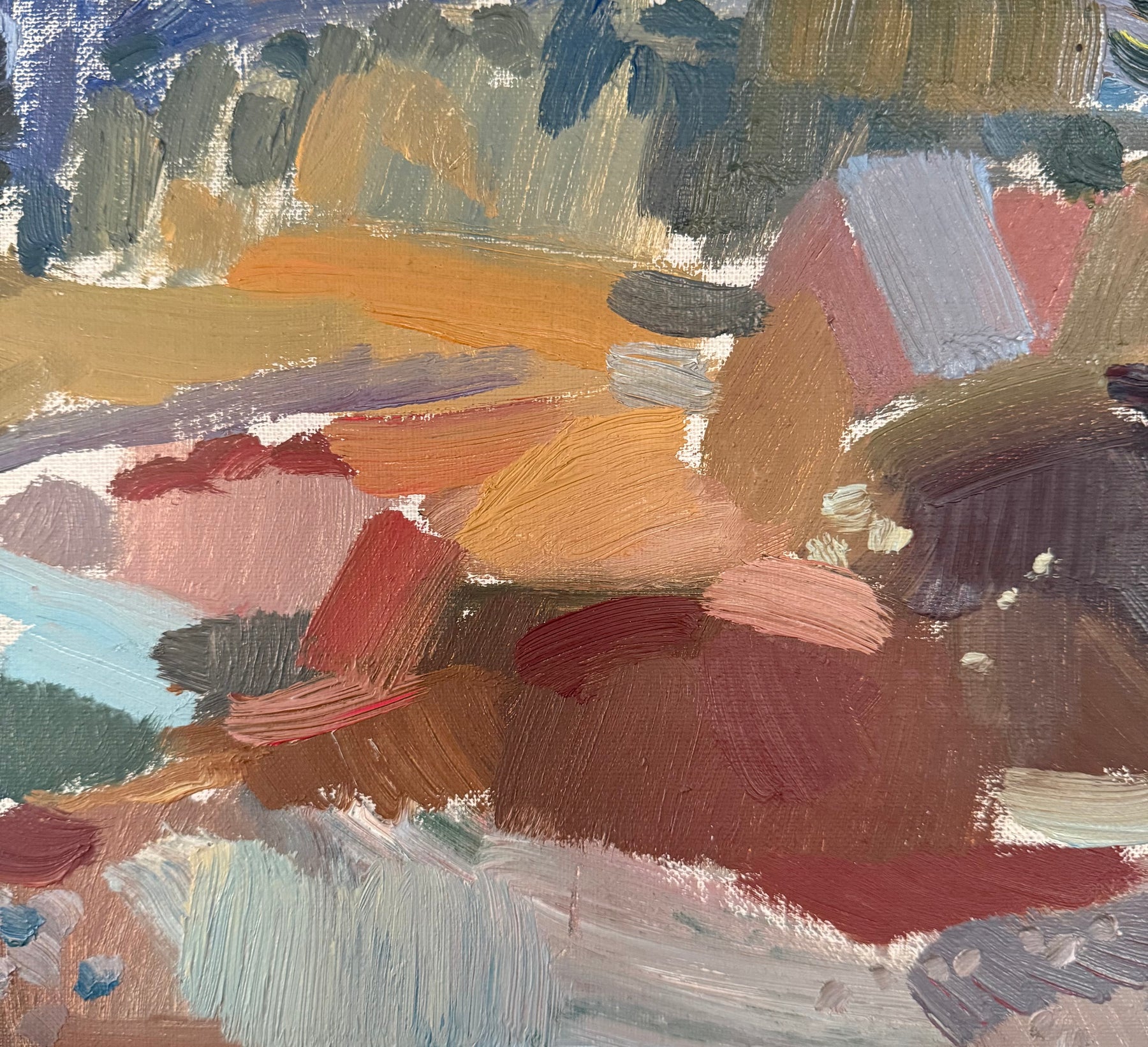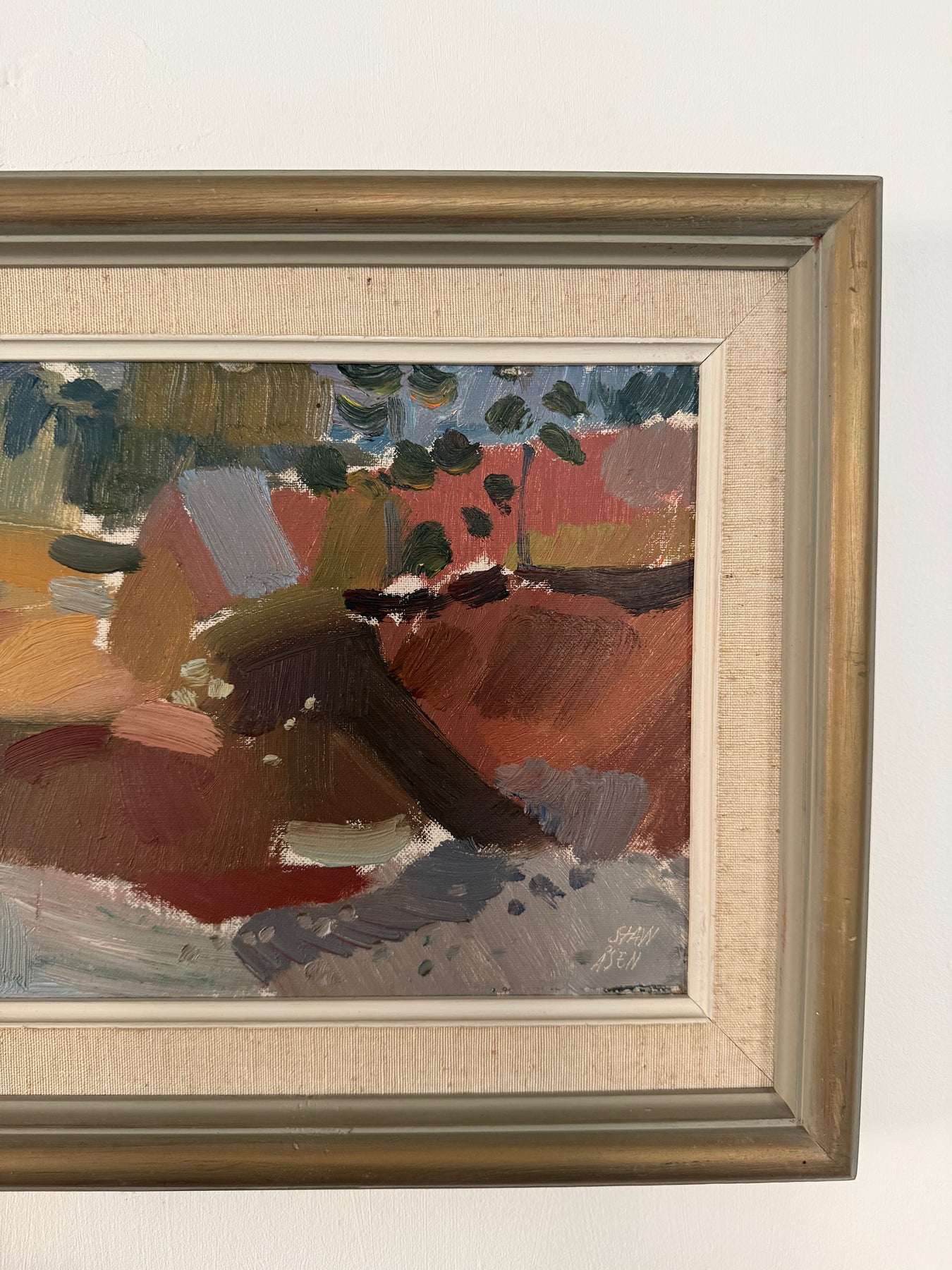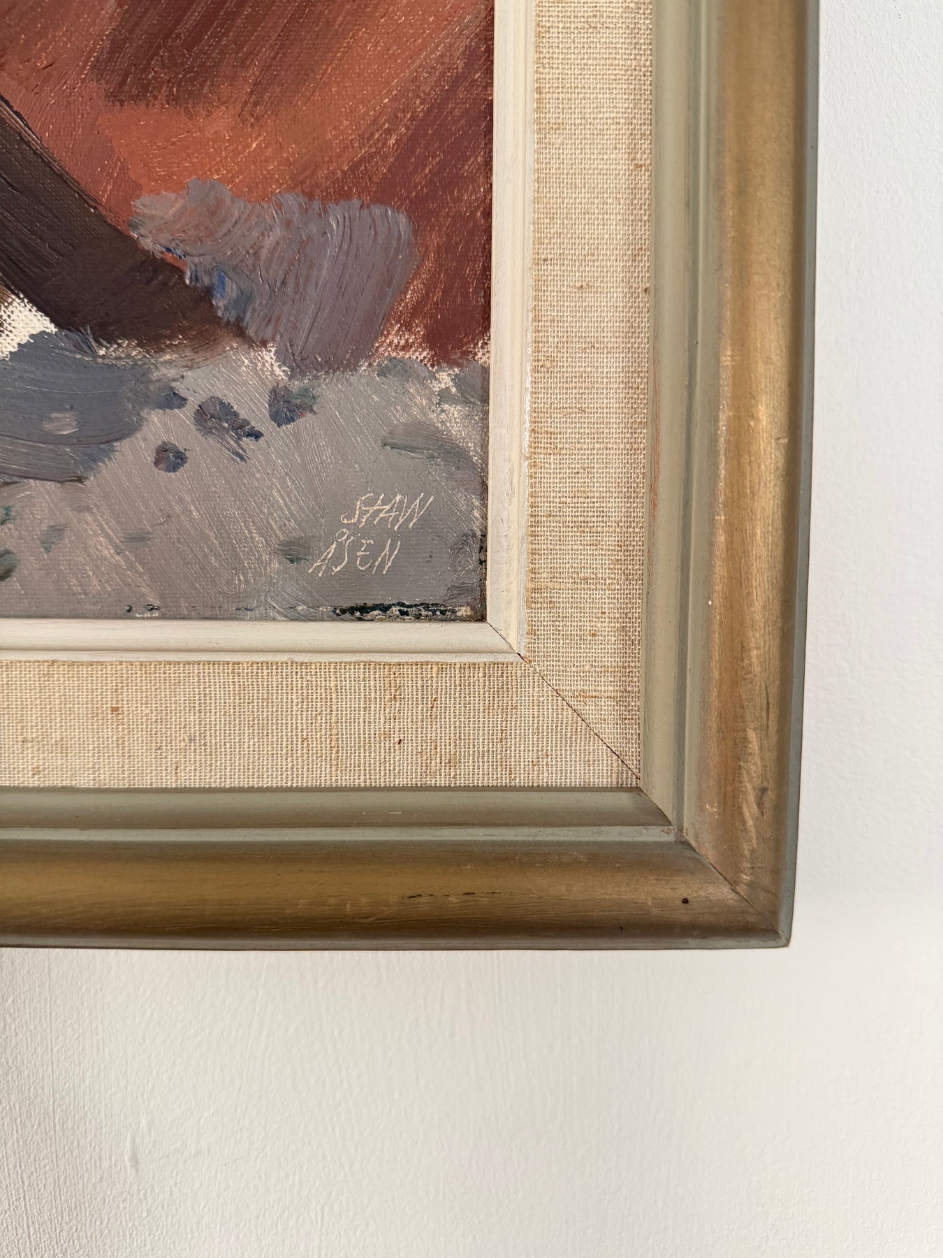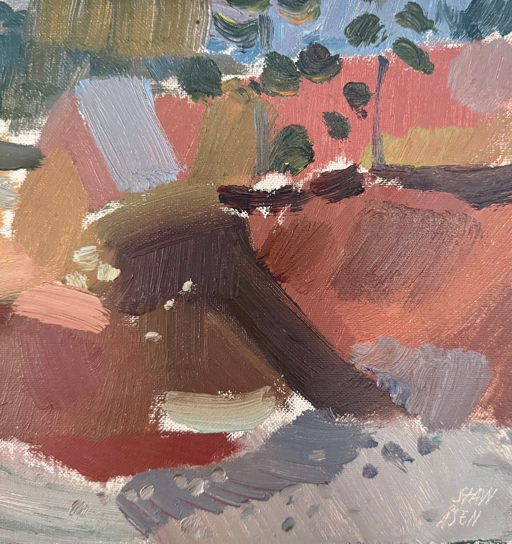 Stawåsen works with a loose, confident hand, allowing forms to break down into layered brushwork. Earthy reds, ochres and soft greens create a warm, cohesive palette, balanced by cooler notes throughout.