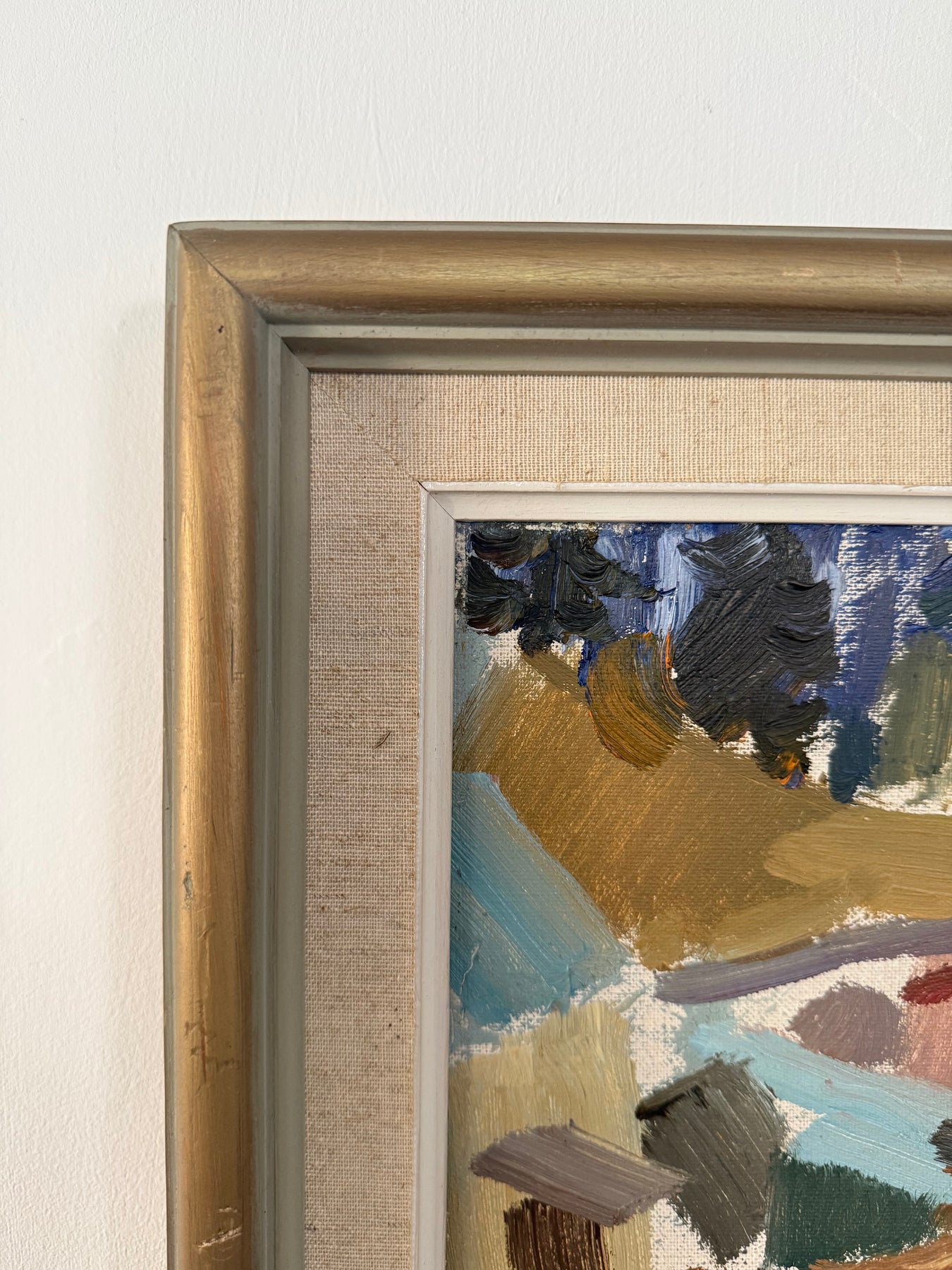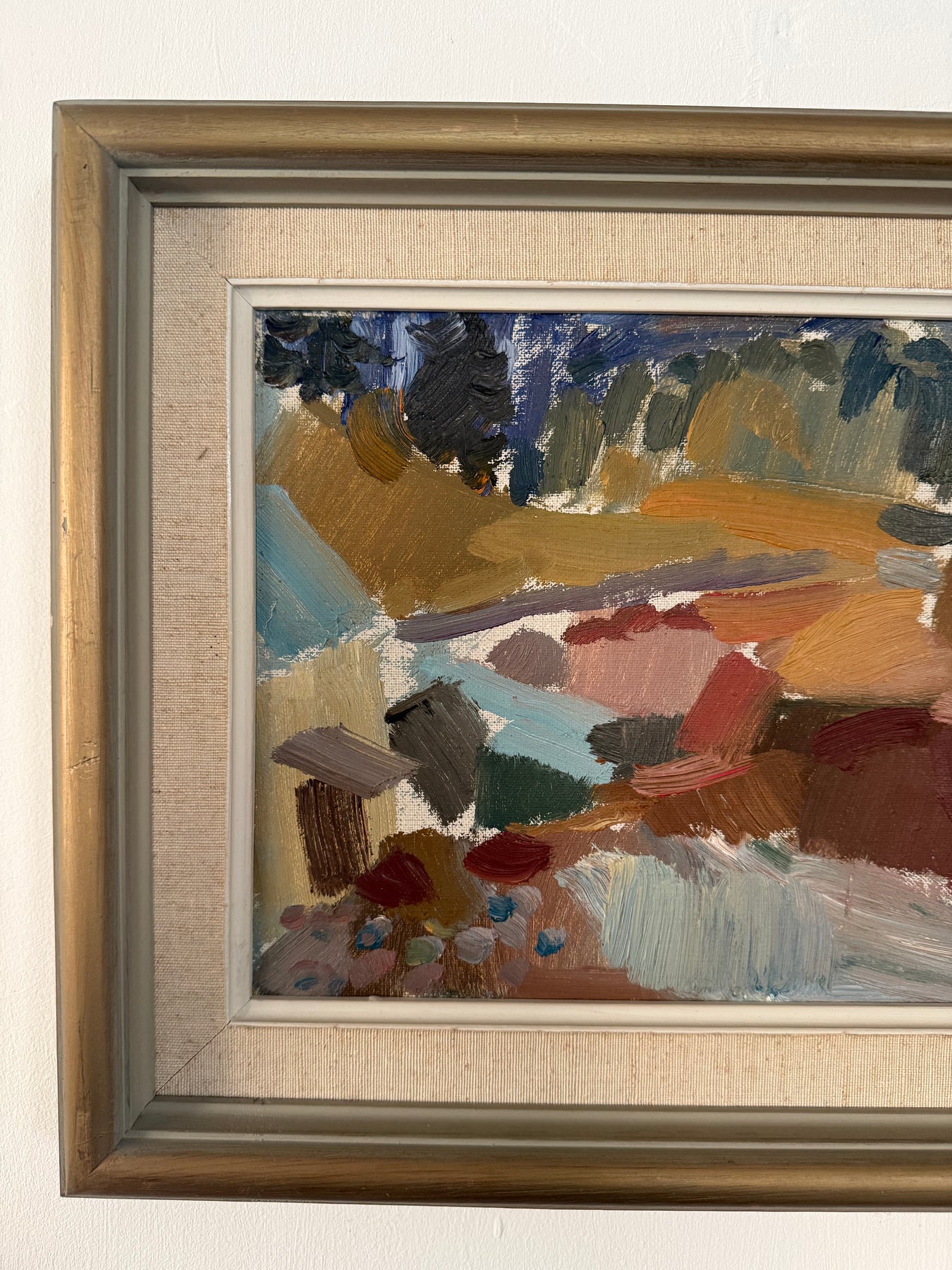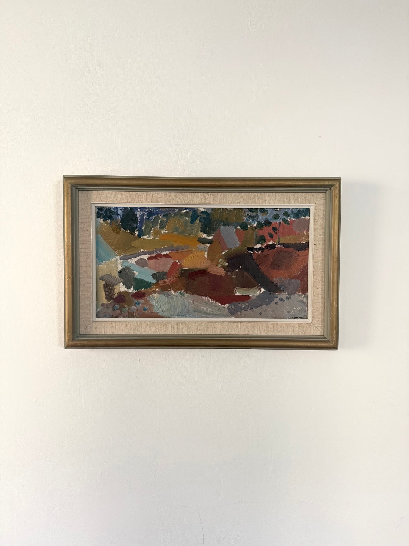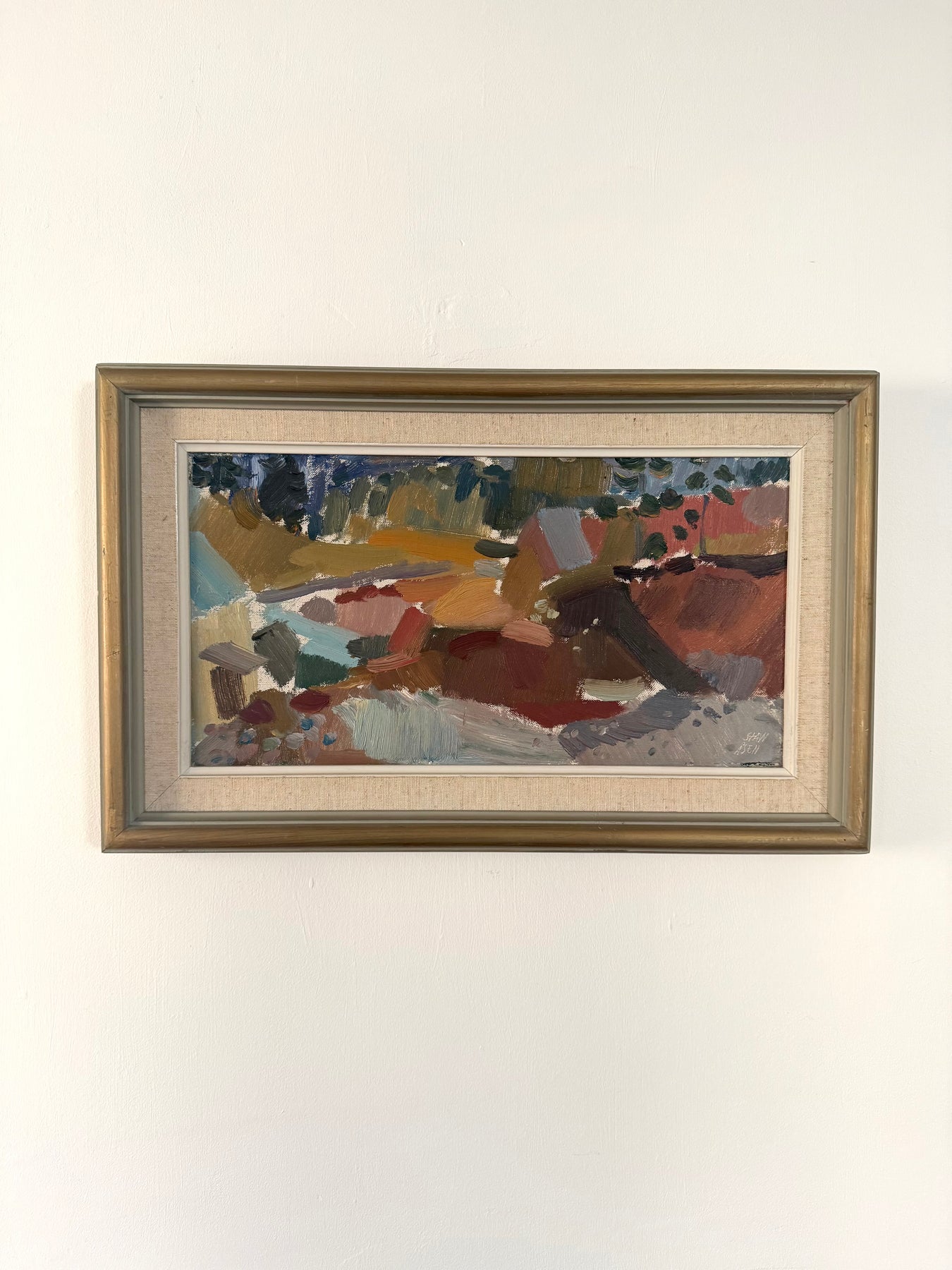 A mid-century landscape reduced to blocks of colour and gesture. Buildings and fields are suggested rather than described, with the composition held together through tone and rhythm.