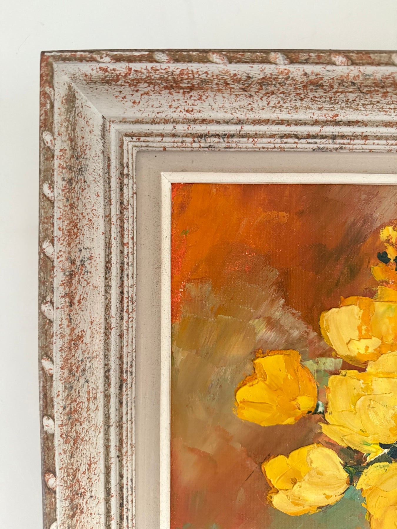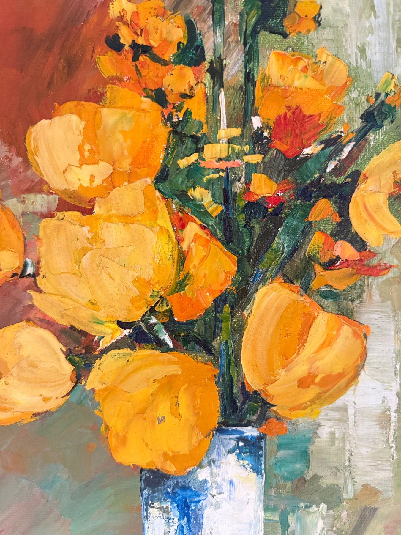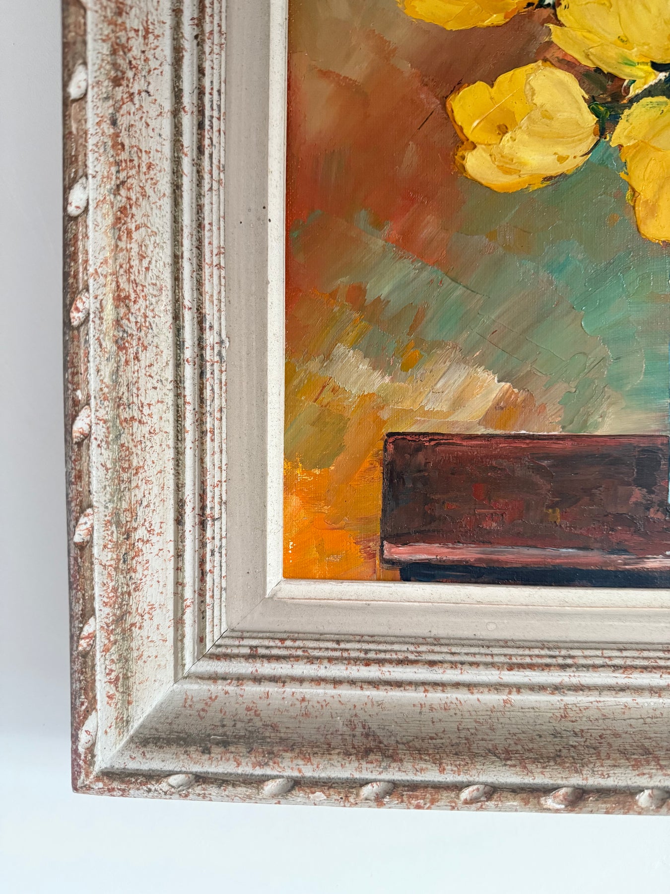 Still life depicting a bouquet of yellow tulips arranged in a simple vase, painted by Pierre Gross in the 20th century. The composition is structured around the contrast between the bright, saturated yellows of the flowers and a muted, loosely worked background.