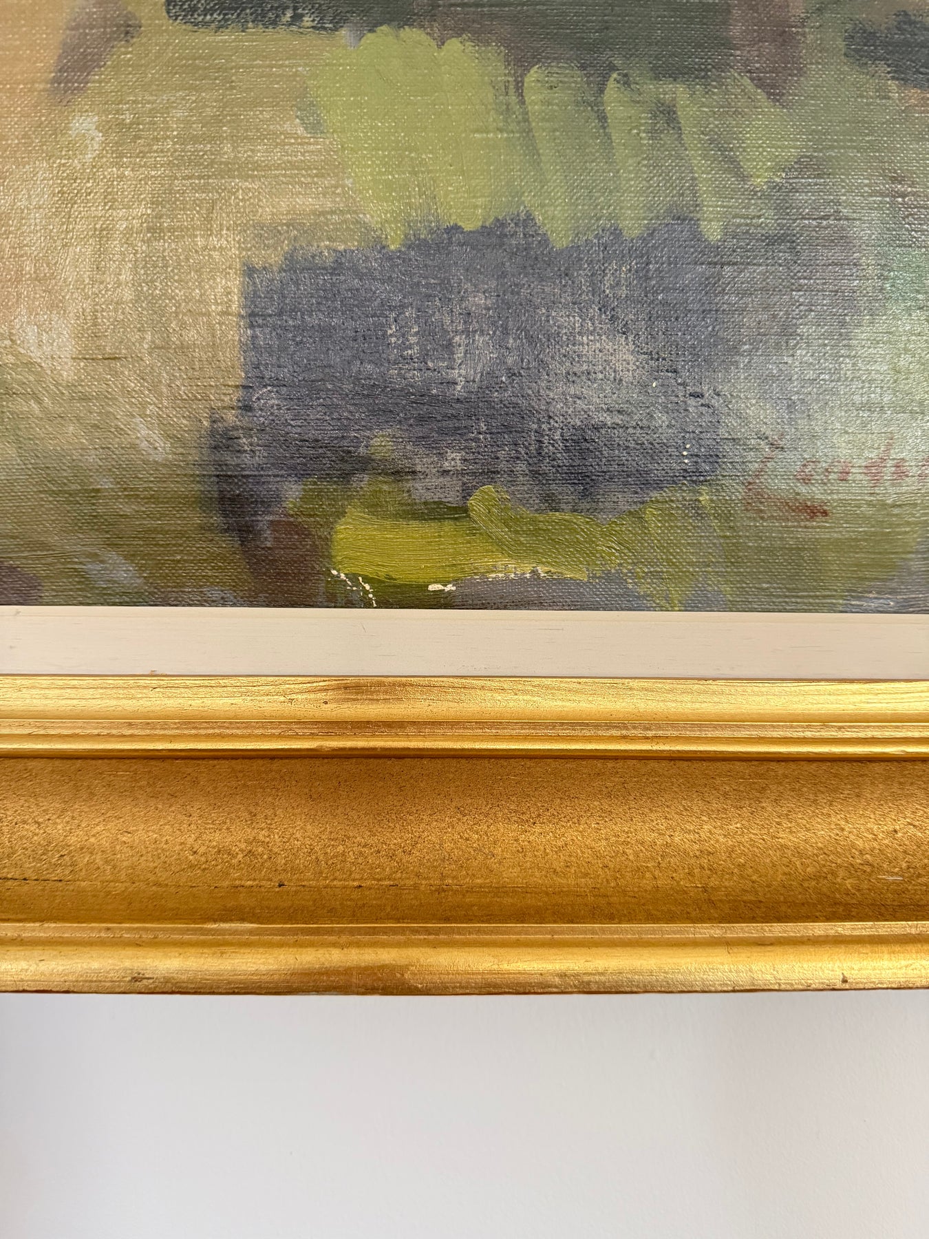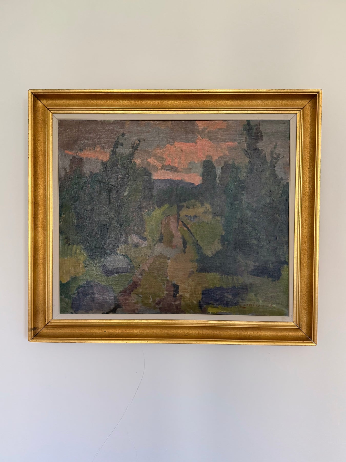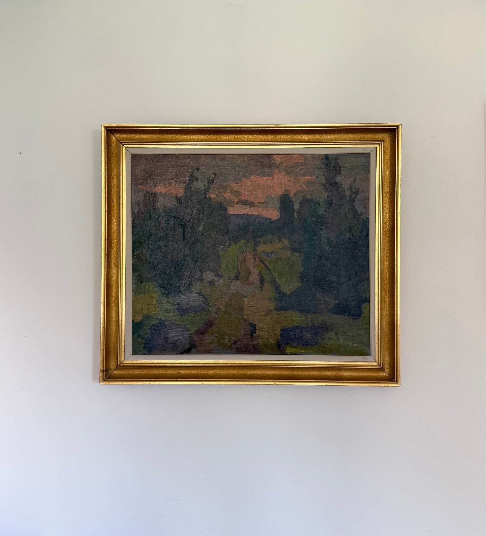 Landelius works with a loose, painterly hand, allowing detail to dissolve into tone and colour. The composition is intentionally understated, with muted greens, earth tones and dusk hues creating a settled, cohesive palette.