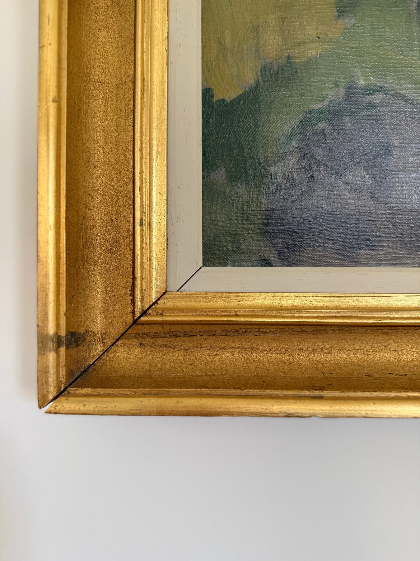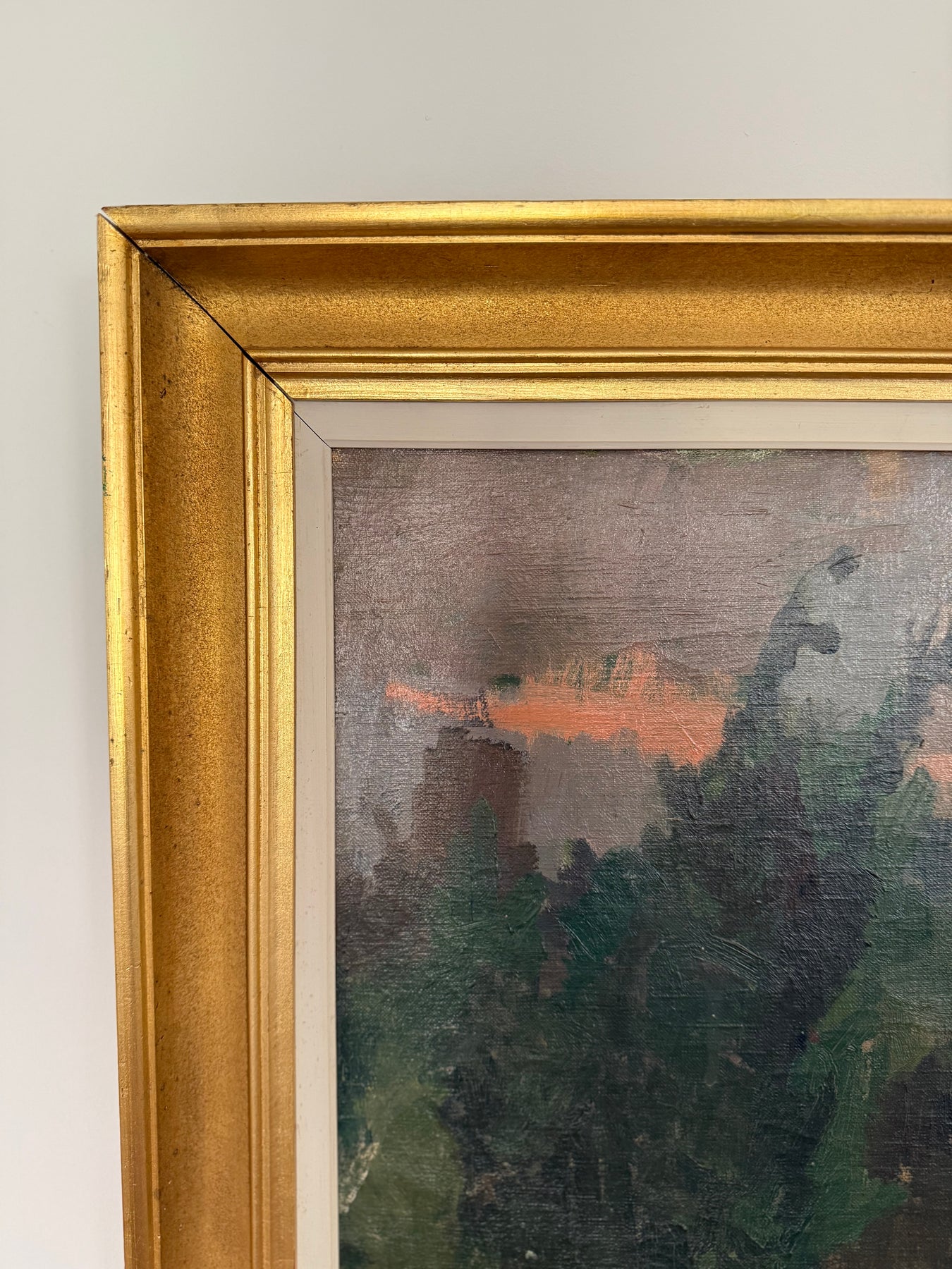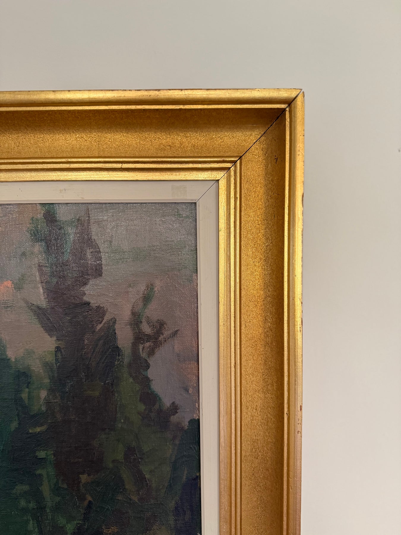 Landelius works with a loose, painterly hand, allowing detail to dissolve into tone and colour. The composition is intentionally understated, with muted greens, earth tones and dusk hues creating a settled, cohesive palette.