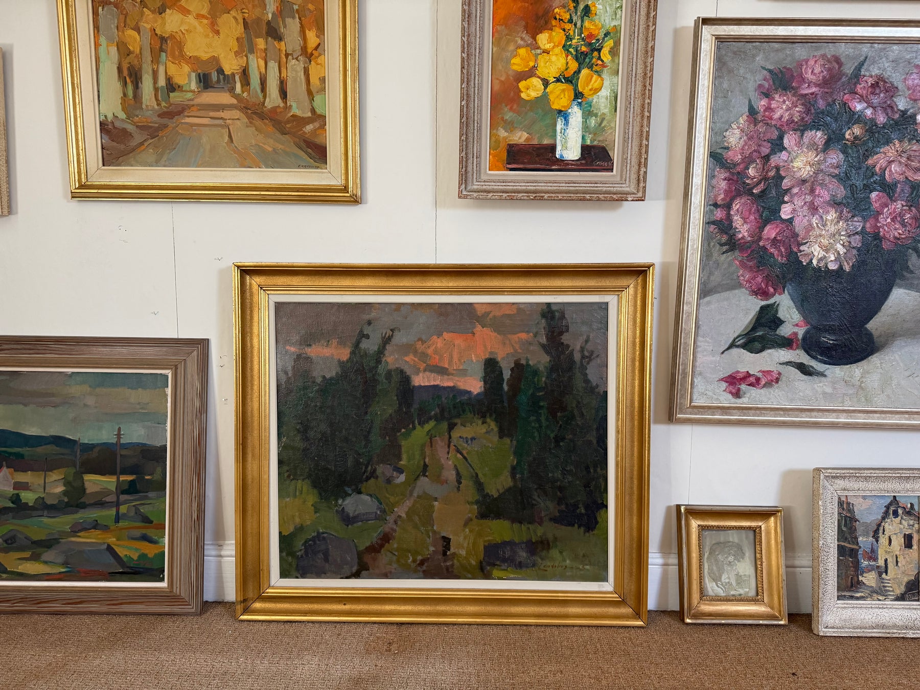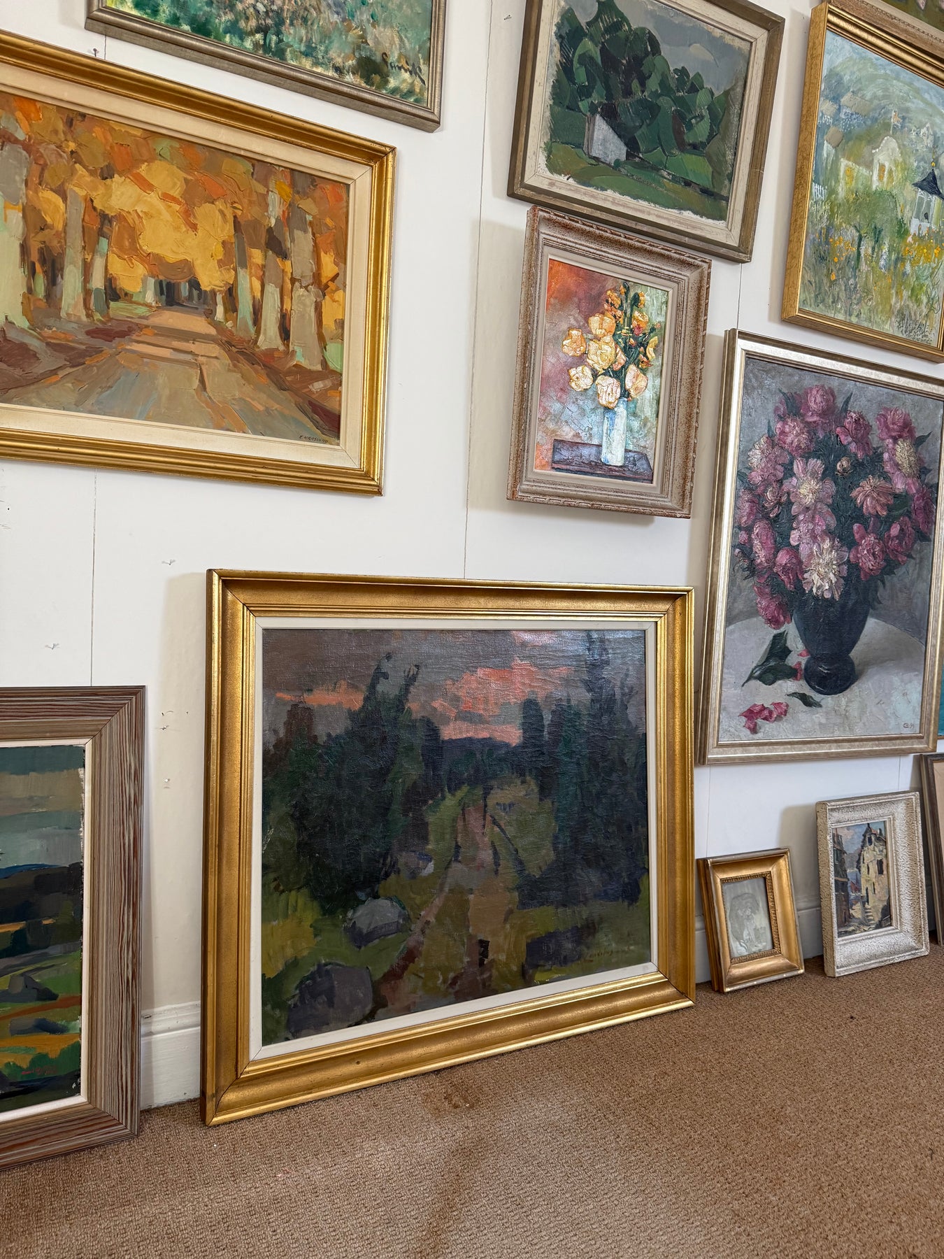 A large mid-century landscape with a calm, atmospheric presence. A path draws the eye gently into the composition, set against a low, warm sky that softens the surrounding forms.