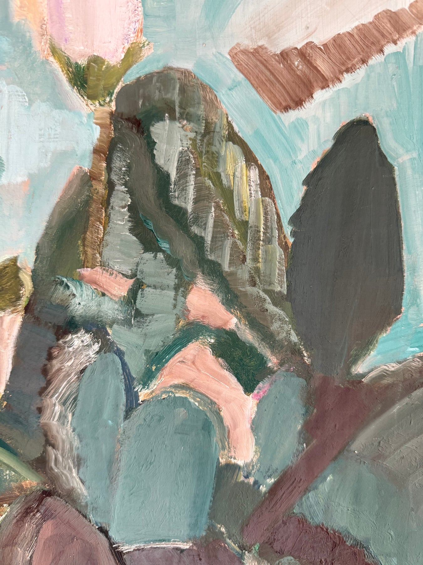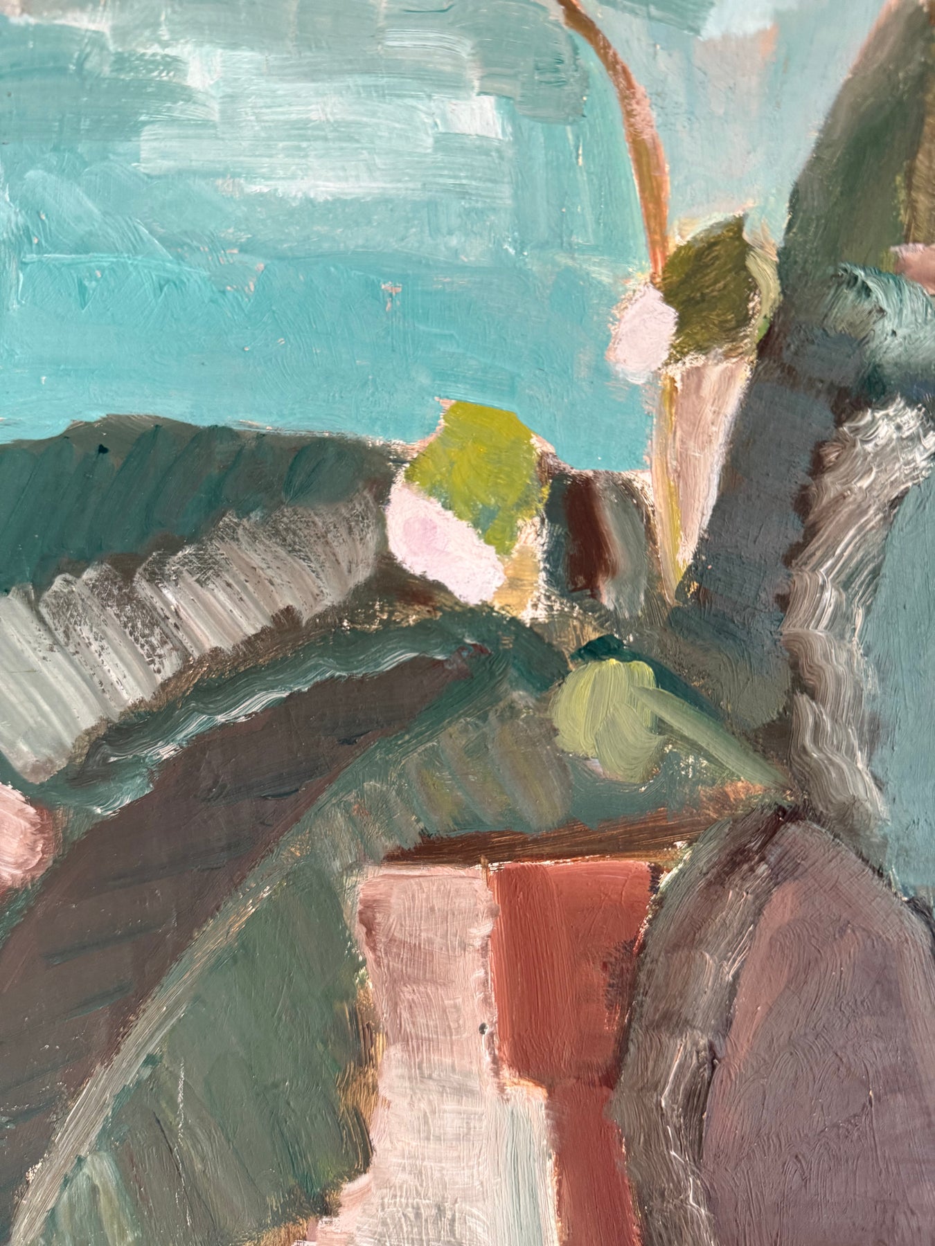 The palette is restrained, built around cool blue-green tones with softer floral accents and touches of warm brown. The composition is compact and self-contained, with the plants filling the frame.