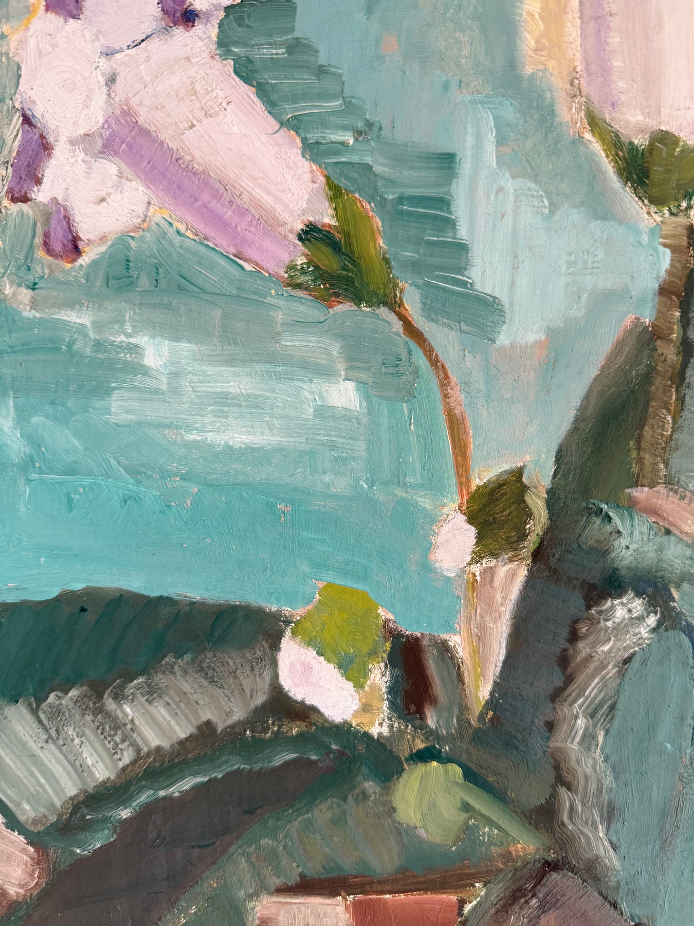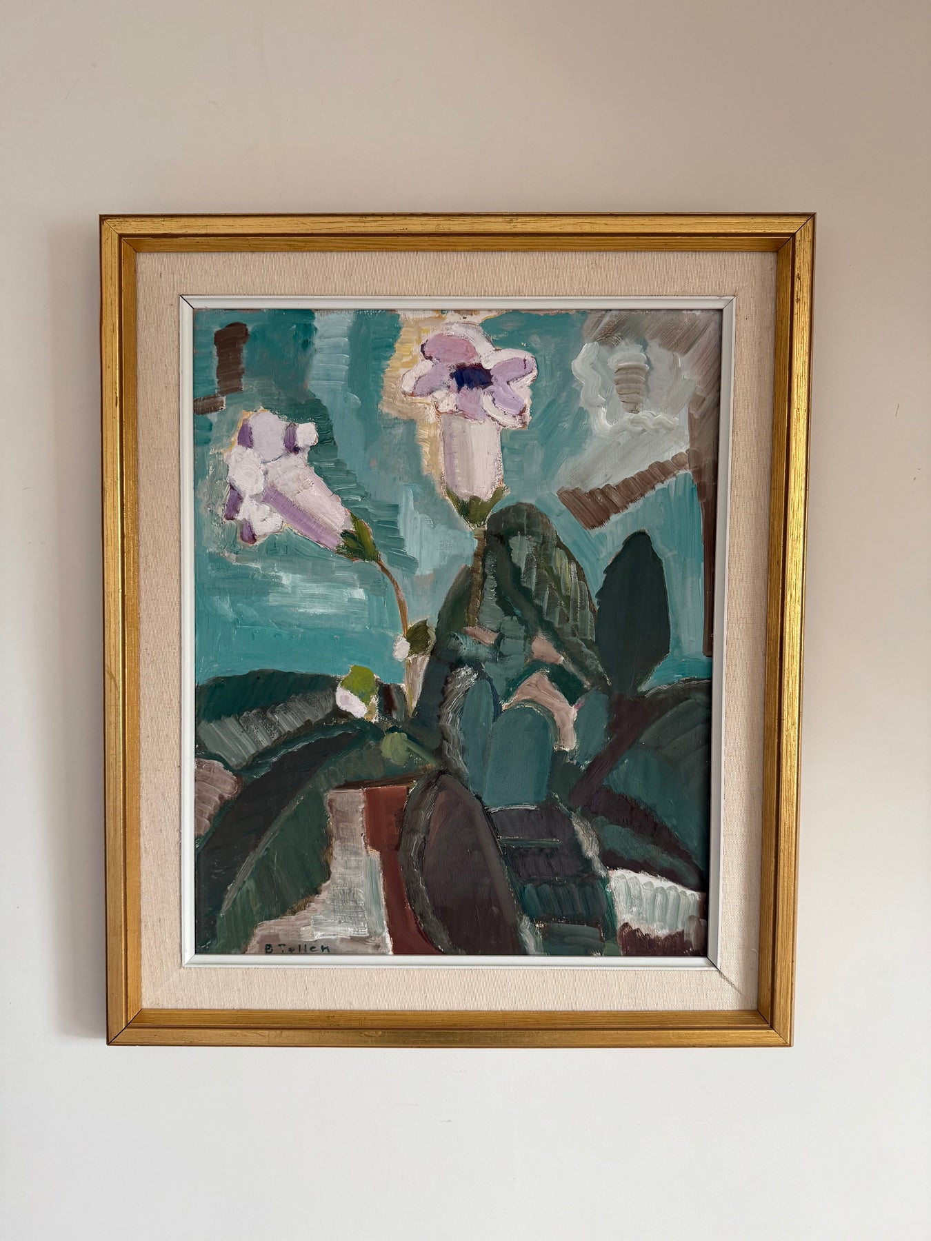 Midcentury oil painting depicting flowering plants arranged as a still life. Broad, dark green leaves anchor the composition, with pale pink and lilac blossoms rising above on slender stems. The forms are simplified and painted with direct, visible brushstrokes, giving the surface a textured, worked quality.