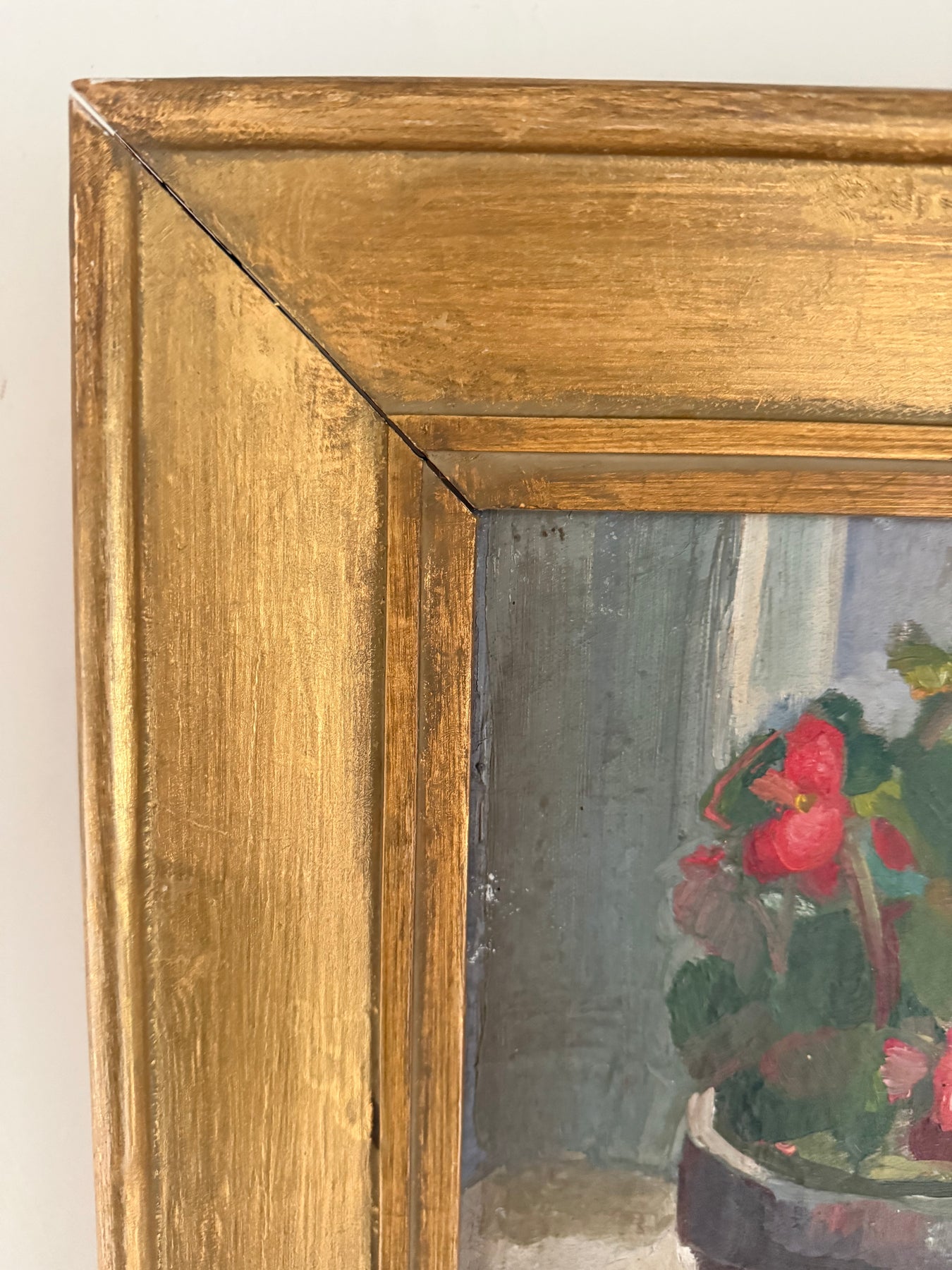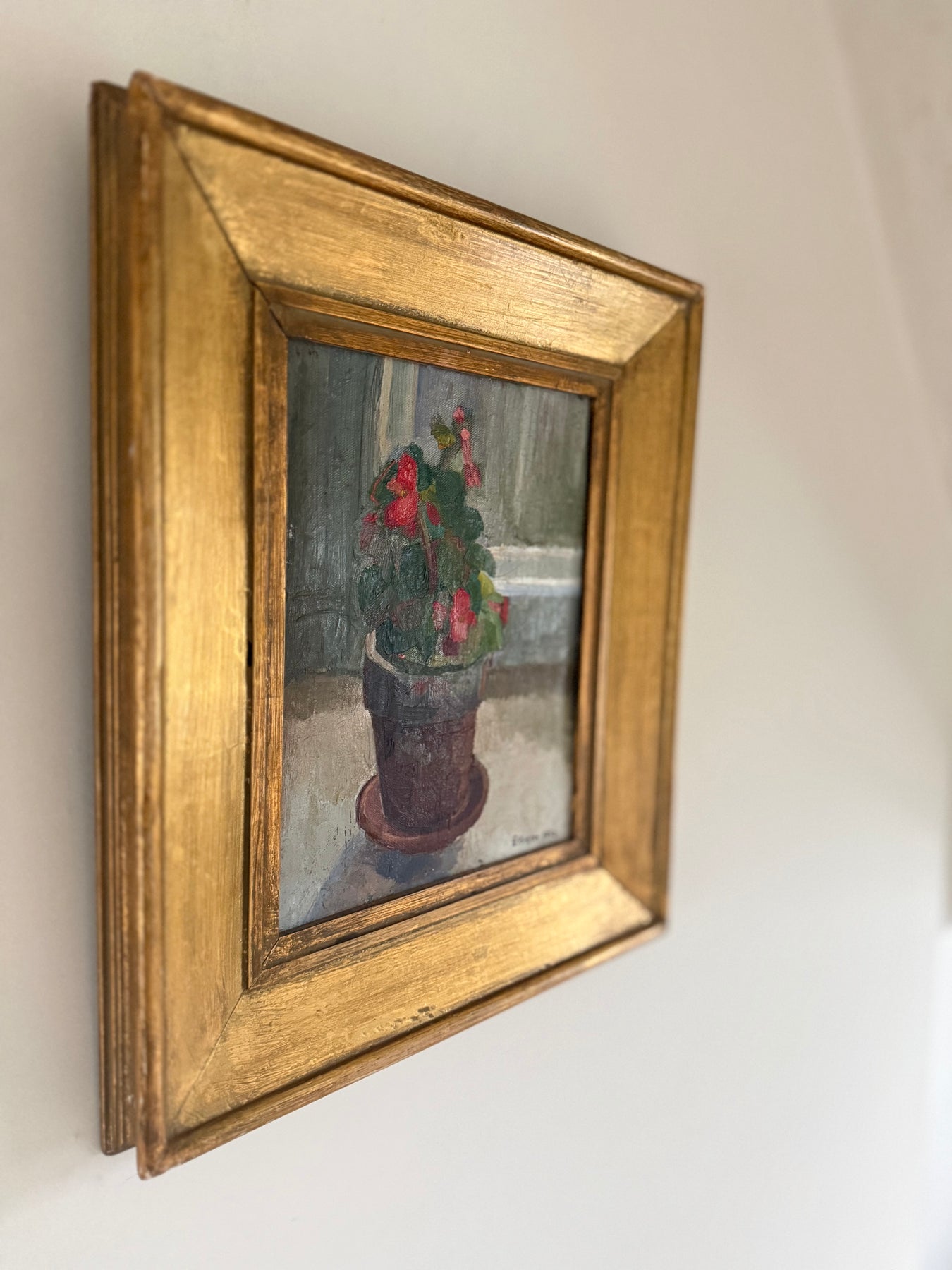 A small, quietly composed still life depicting a potted geranium set on a windowsill. The terracotta pot, with its soft sheen and weight, anchors the composition, while the red blossoms and thick green leaves are handled with confident, economical brushwork. The background is pared back — cool greys and muted light suggesting an interior space washed with daylight.
