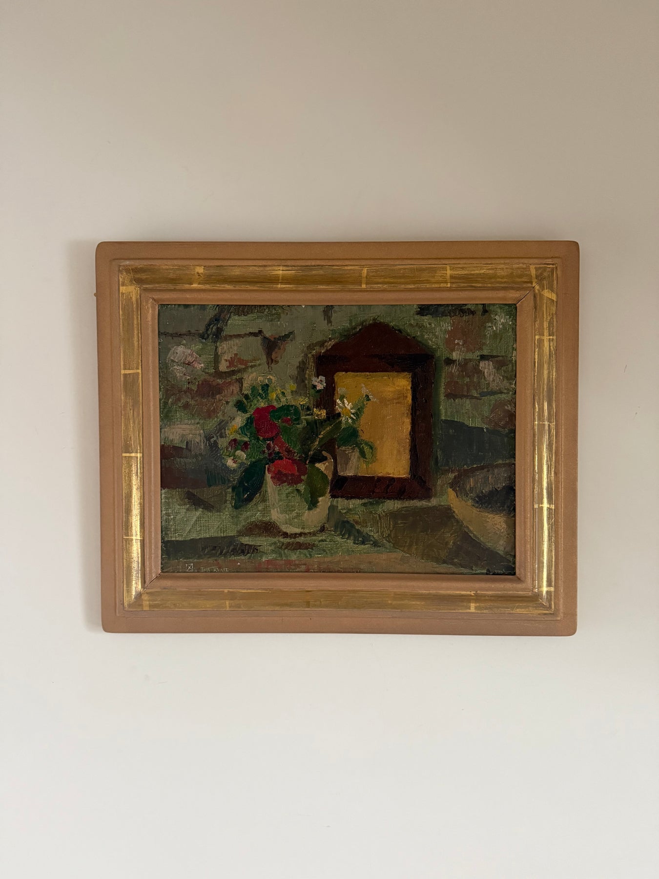 A still life of red flowers set against a muted frame by artist Nisse Zetterberg (Sweden, 1910-1986).