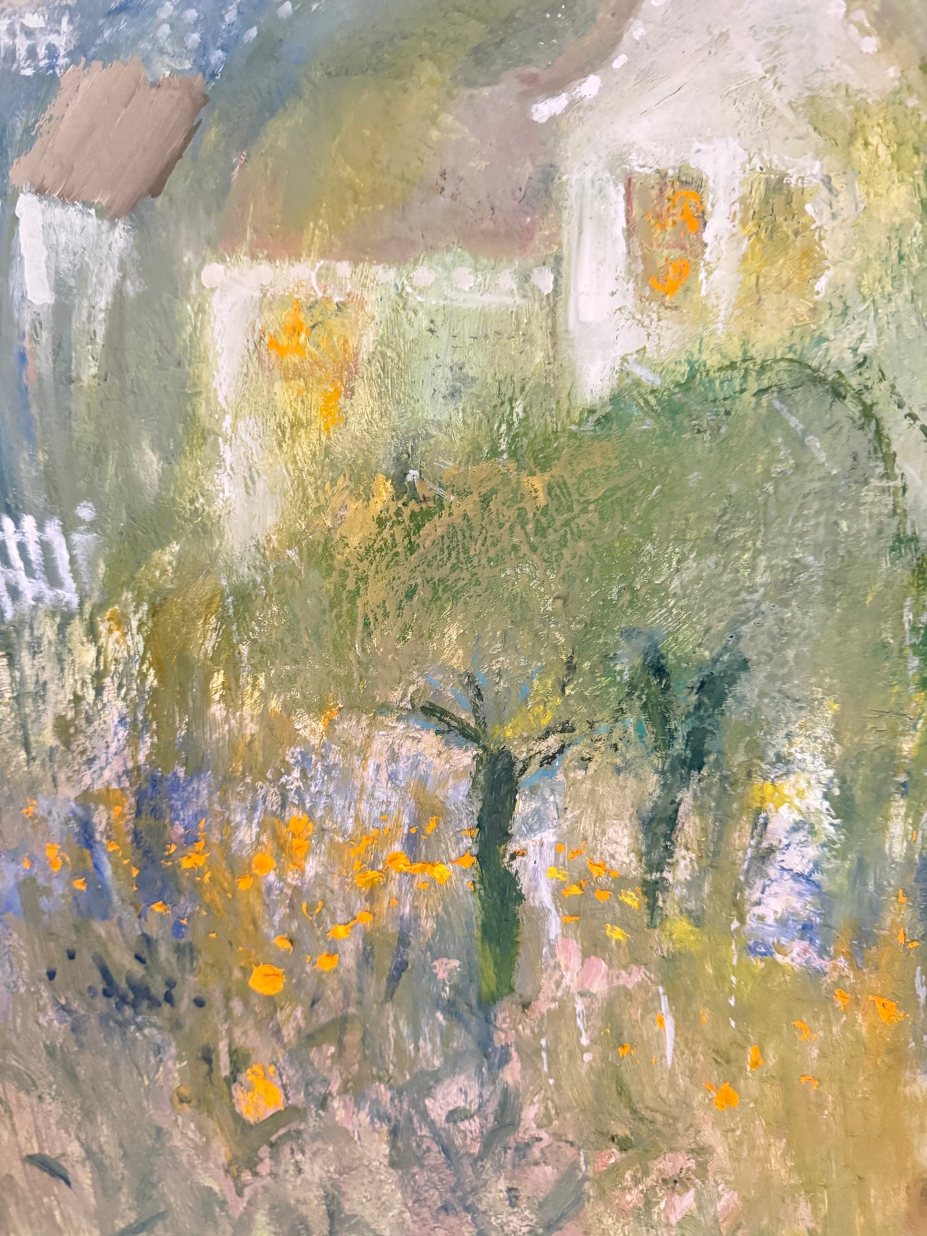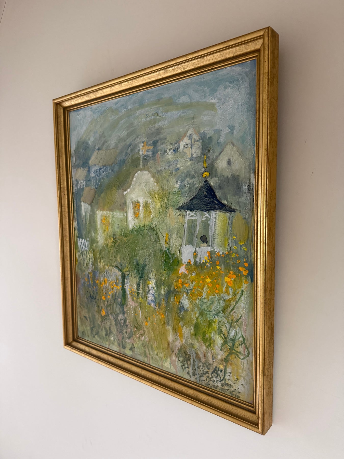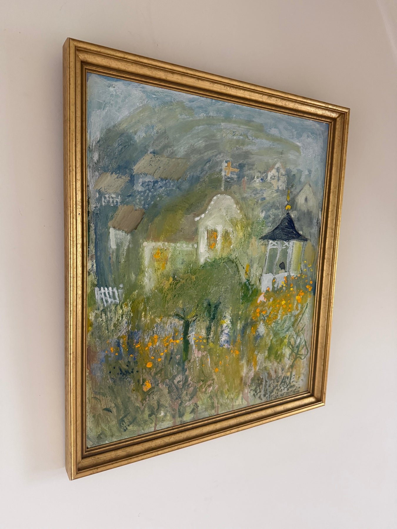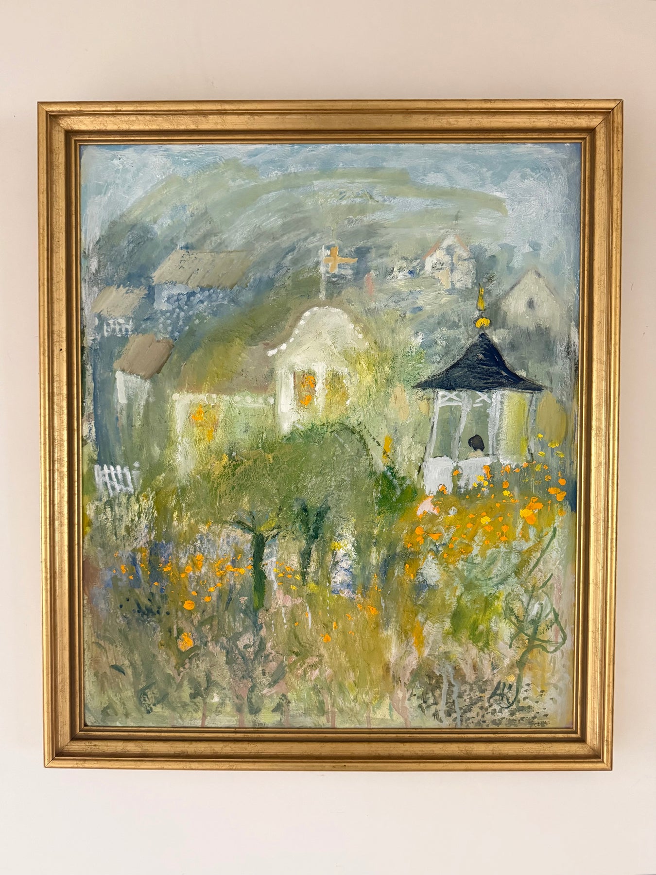 A romantic garden scene rendered in soft, layered brushwork. A cluster of cottages sits beneath a pale, swirling sky, while a small pavilion anchors the right of the composition, where a seated figure is just visible within the structure. The foreground is animated with loose foliage and scattered yellow blossoms, applied in brighter dabs that lift the otherwise muted palette of greens and blue-greys.
