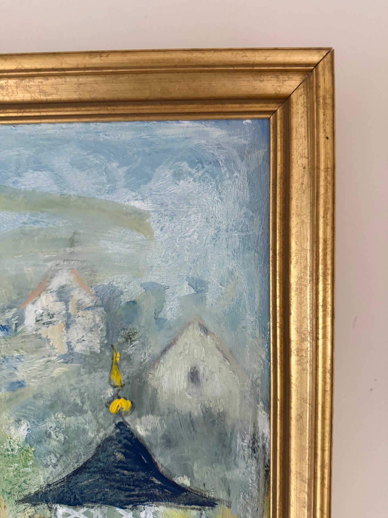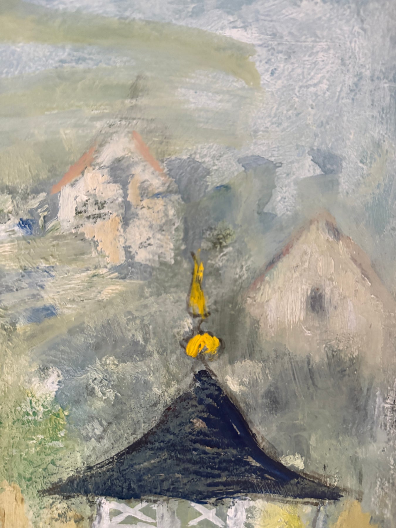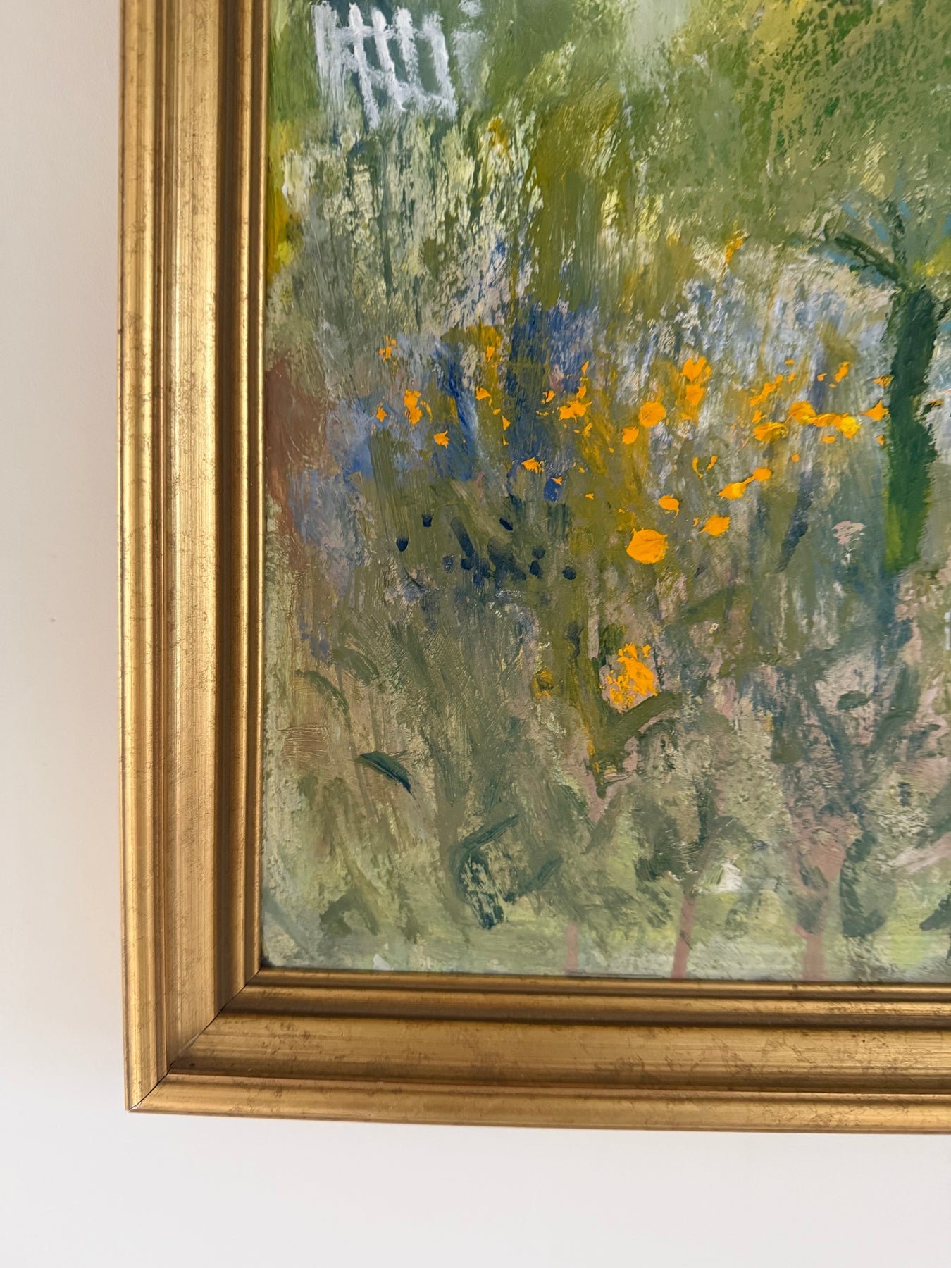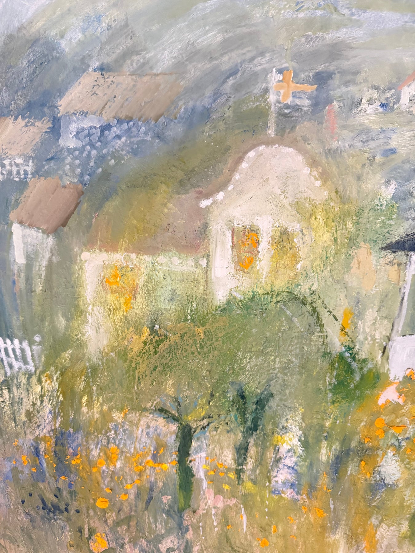 A romantic garden scene rendered in soft, layered brushwork. A cluster of cottages sits beneath a pale, swirling sky, while a small pavilion anchors the right of the composition, where a seated figure is just visible within the structure. The foreground is animated with loose foliage and scattered yellow blossoms, applied in brighter dabs that lift the otherwise muted palette of greens and blue-greys.