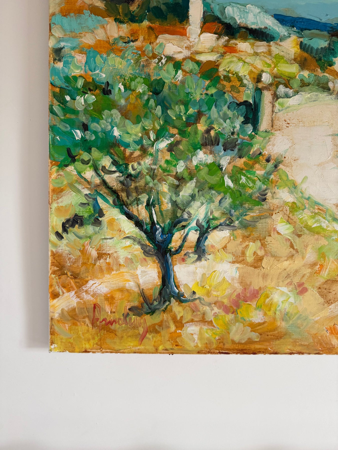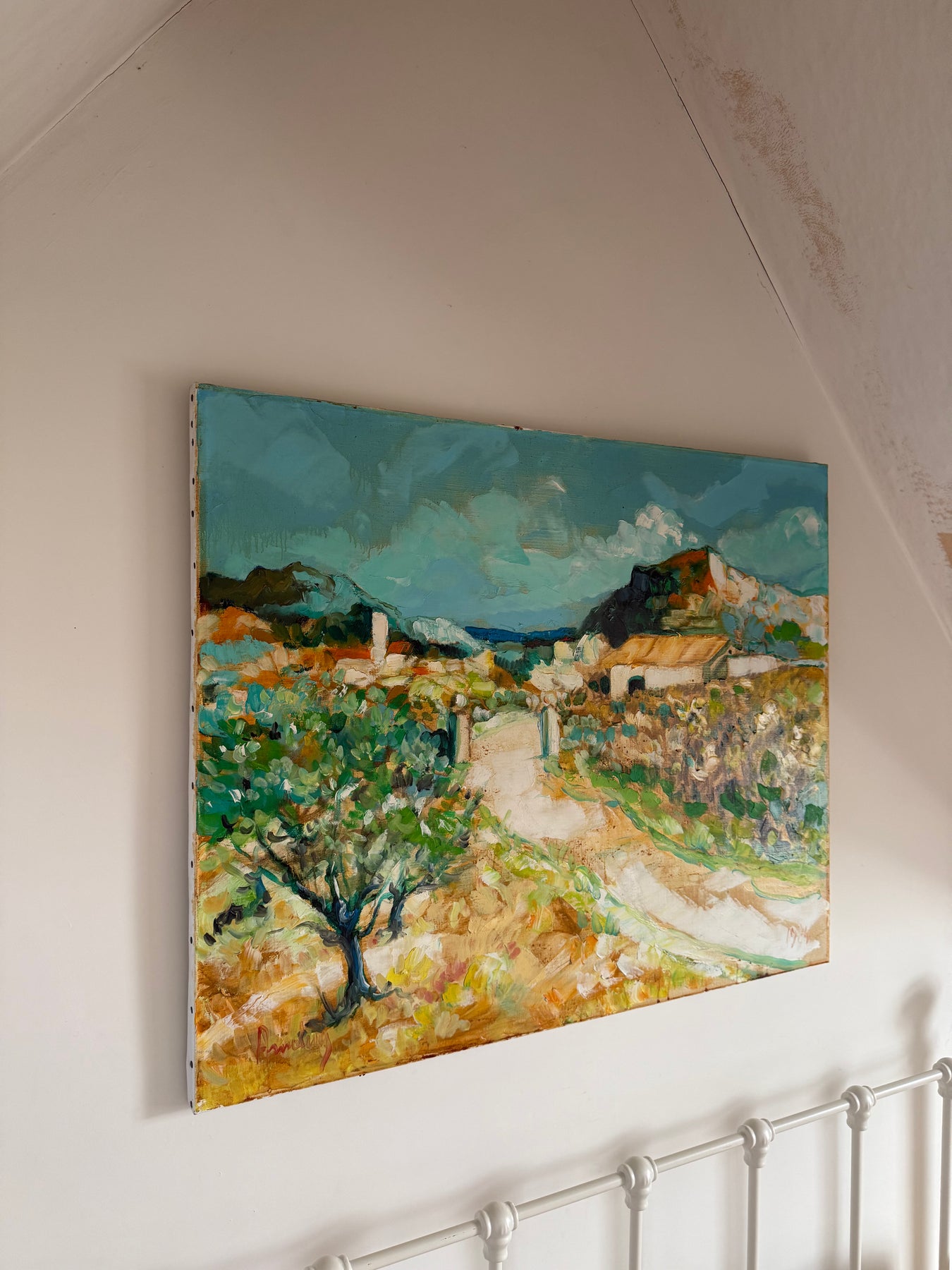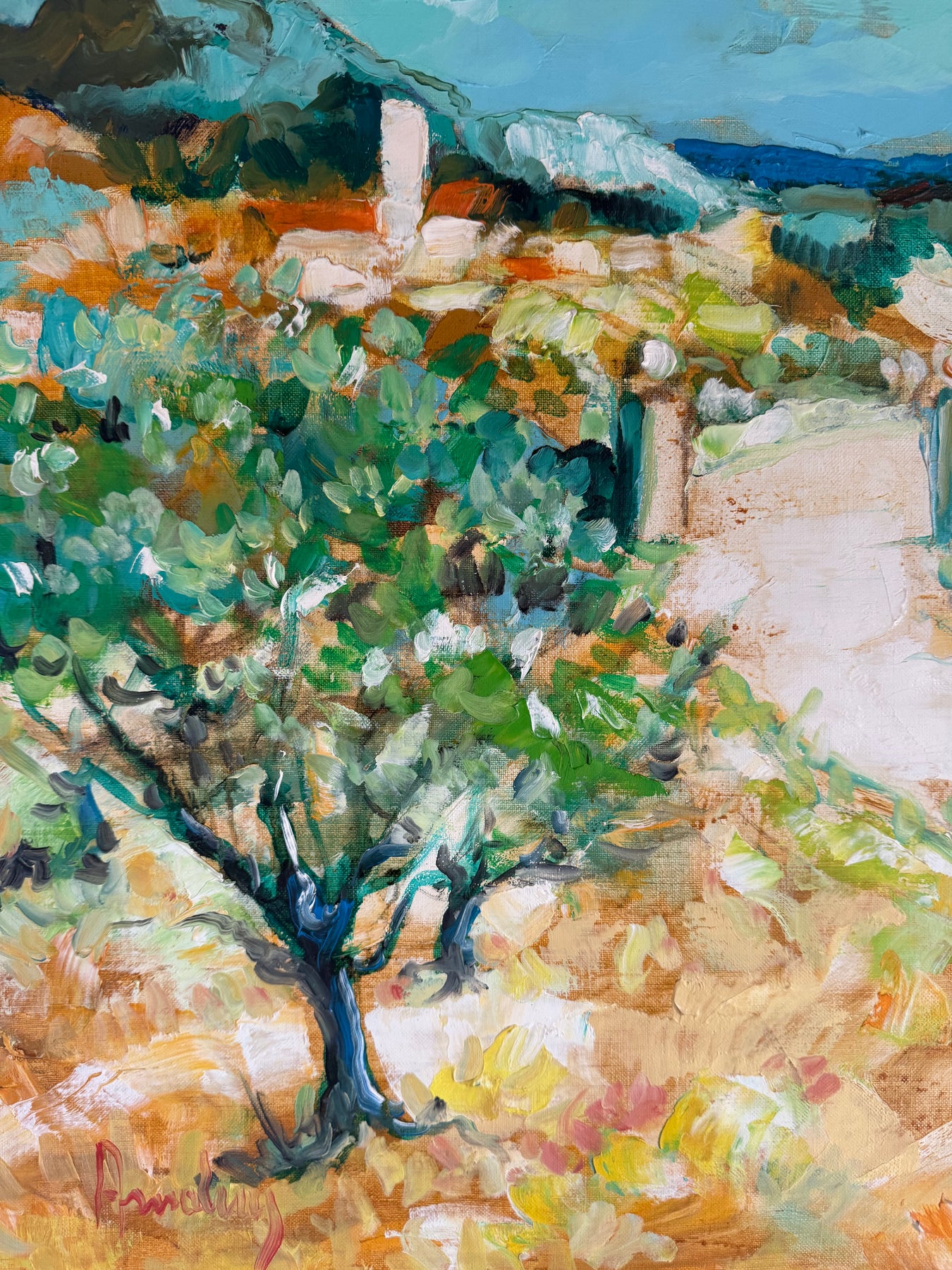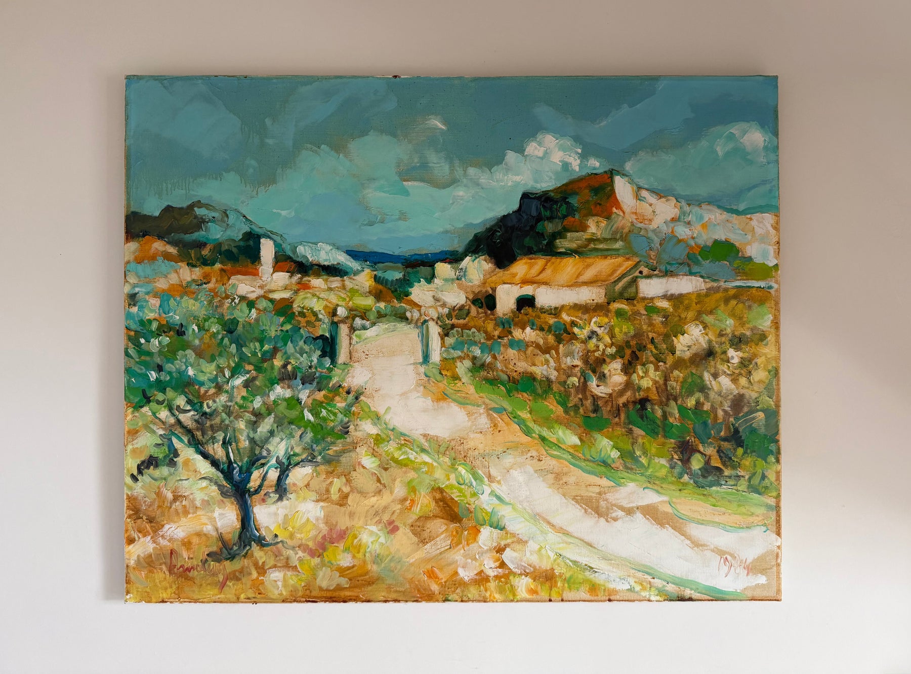 Soft greens, sandy ochres and pale blues create a relaxed Mediterranean feel, while the winding path gently leads the eye through the landscape towards the houses in the distance.
