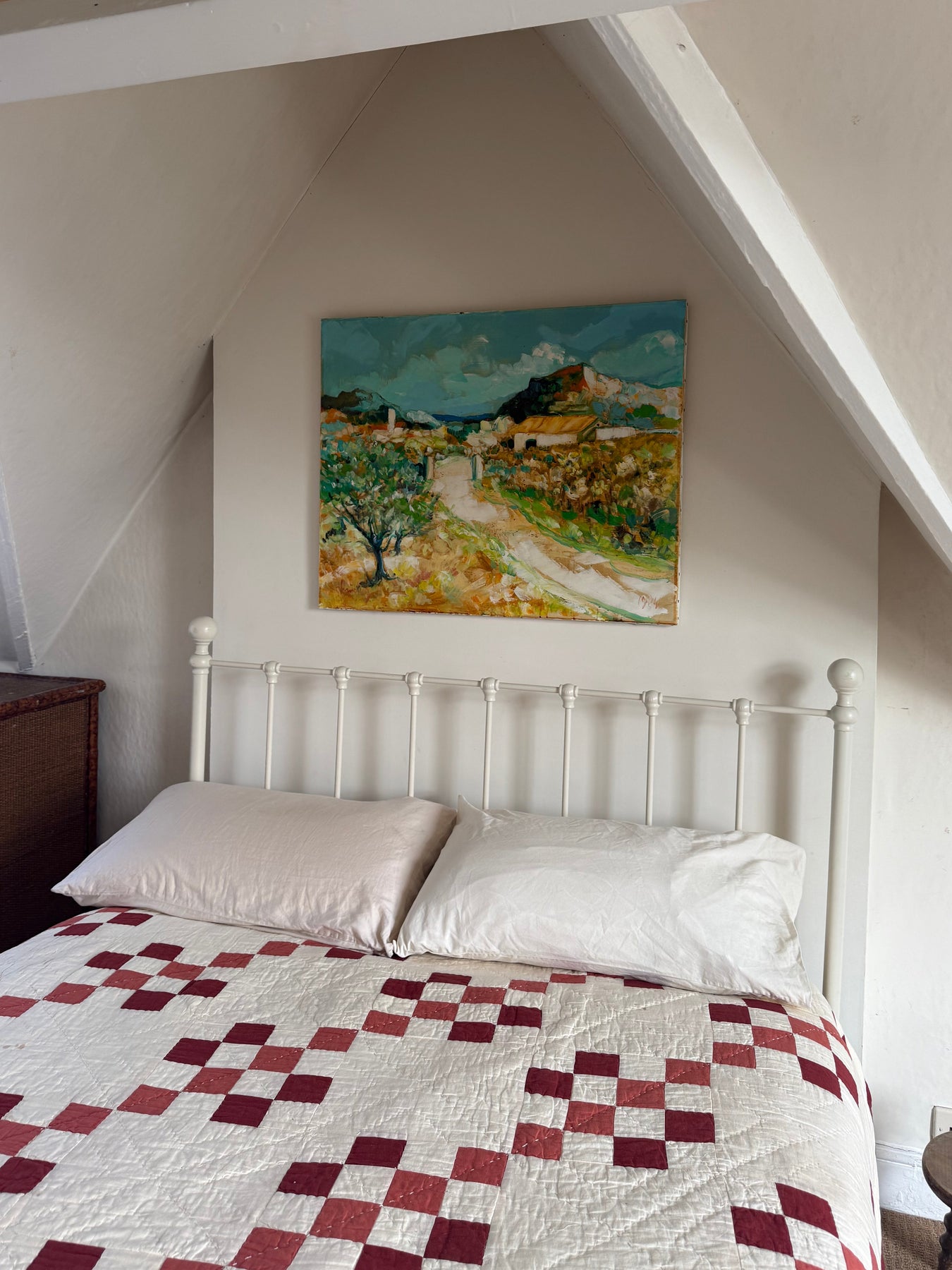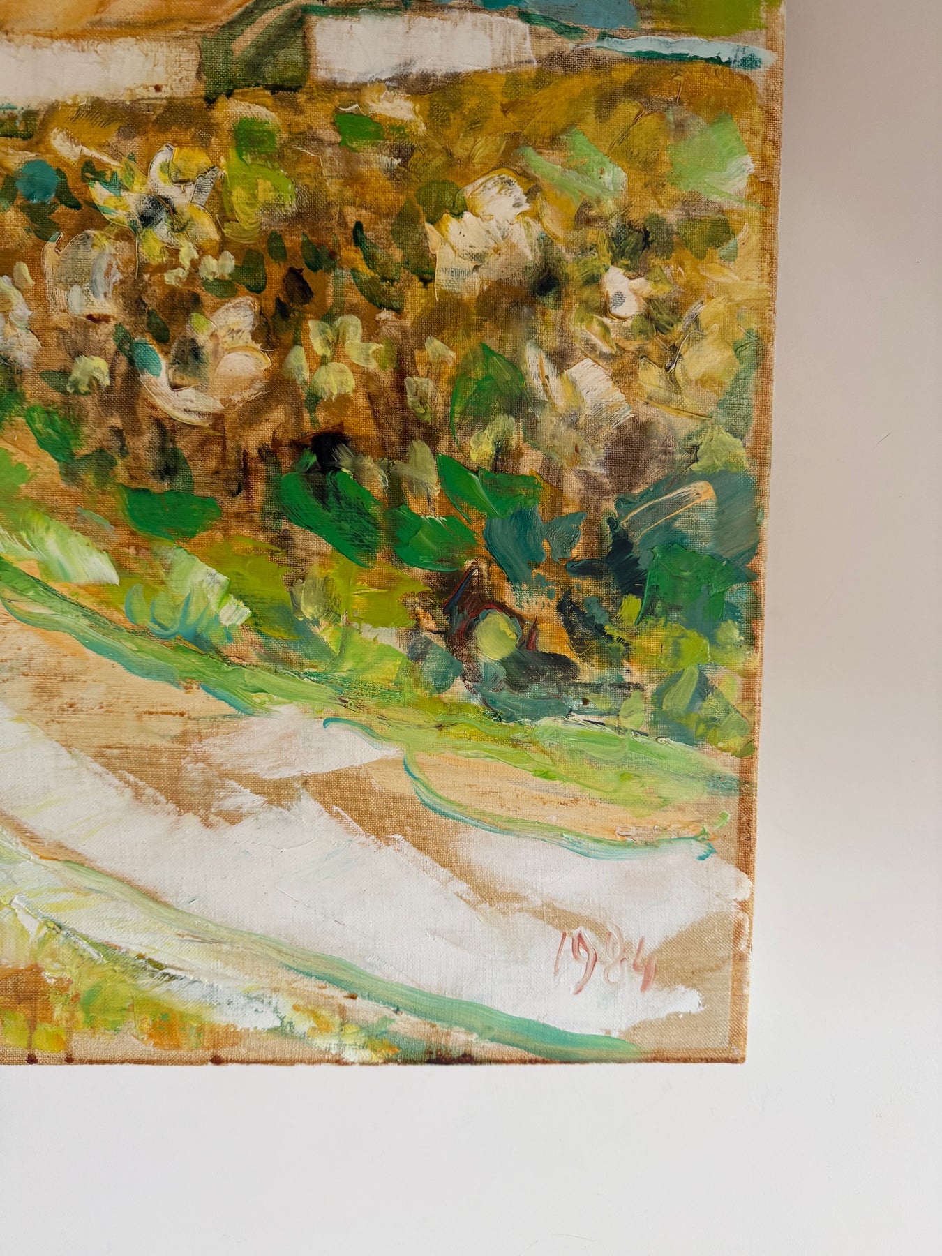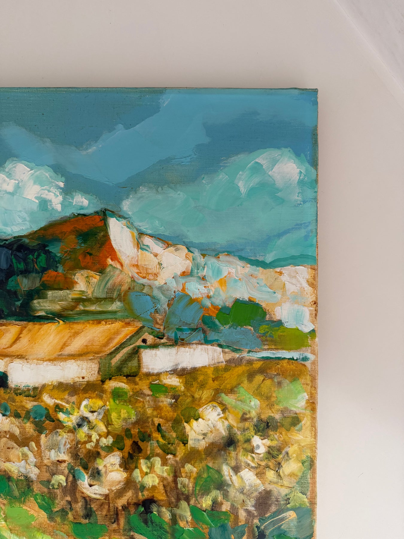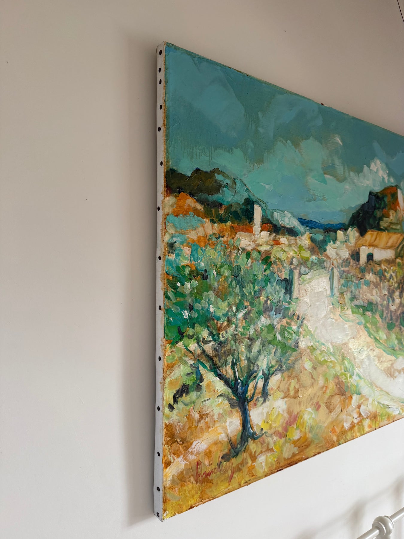Soft greens, sandy ochres and pale blues create a relaxed Mediterranean feel, while the winding path gently leads the eye through the landscape towards the houses in the distance.