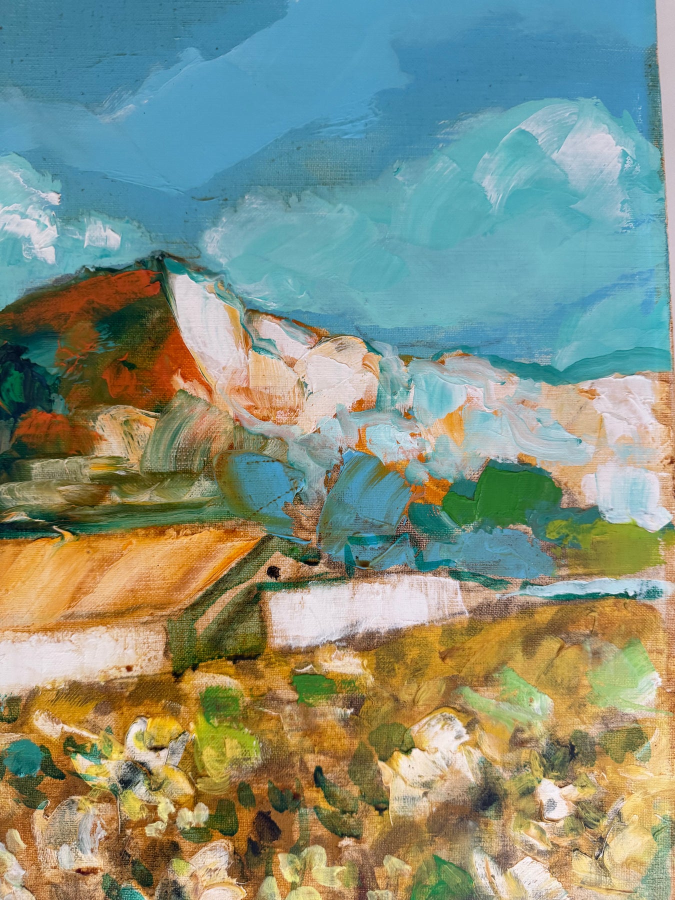 A large, colourful and lively mid-century landscape showing a hillside village and fields under a wide blue sky. The scene is built up with loose, confident brushstrokes, giving the painting a sense of movement and warmth.