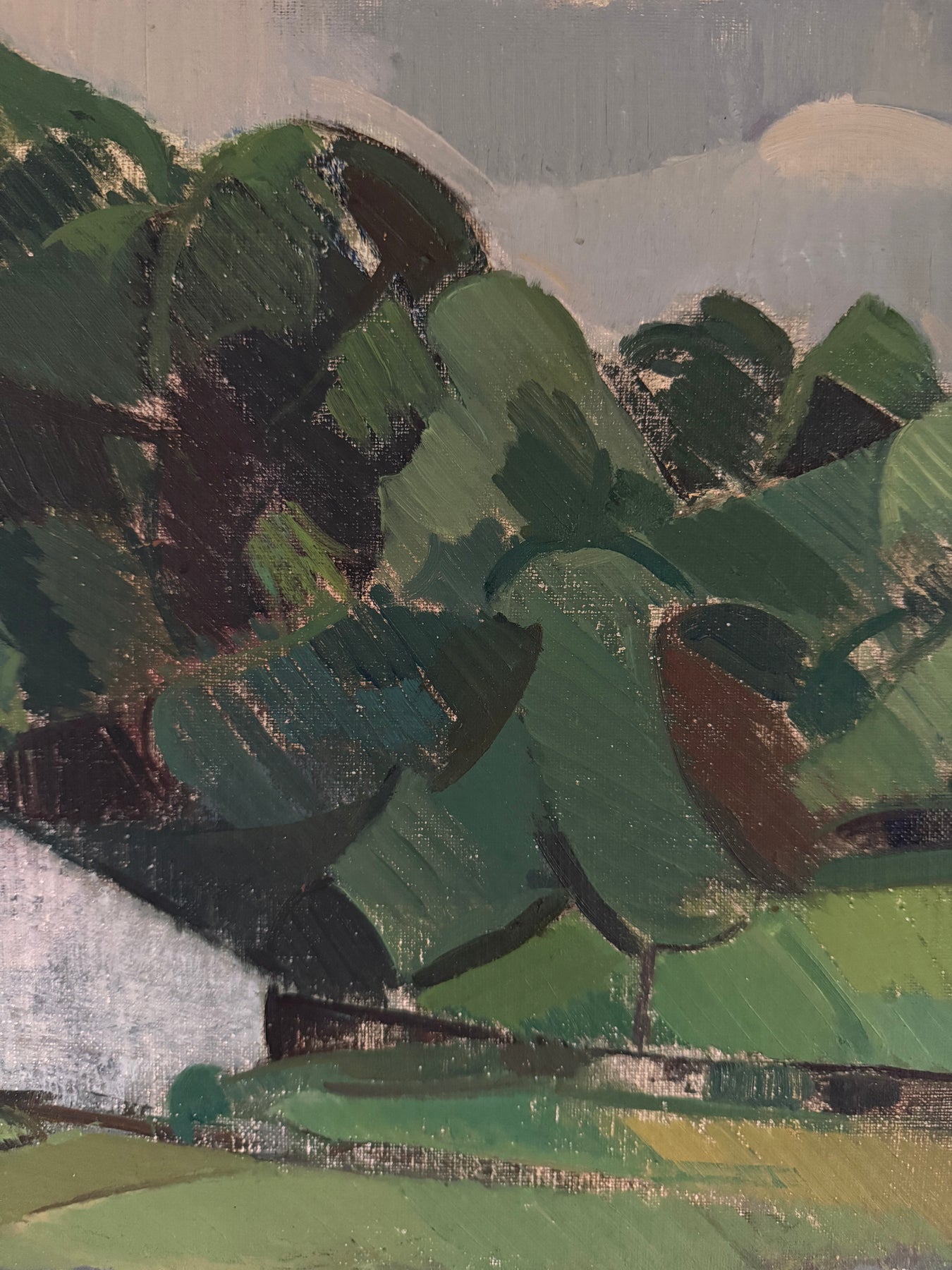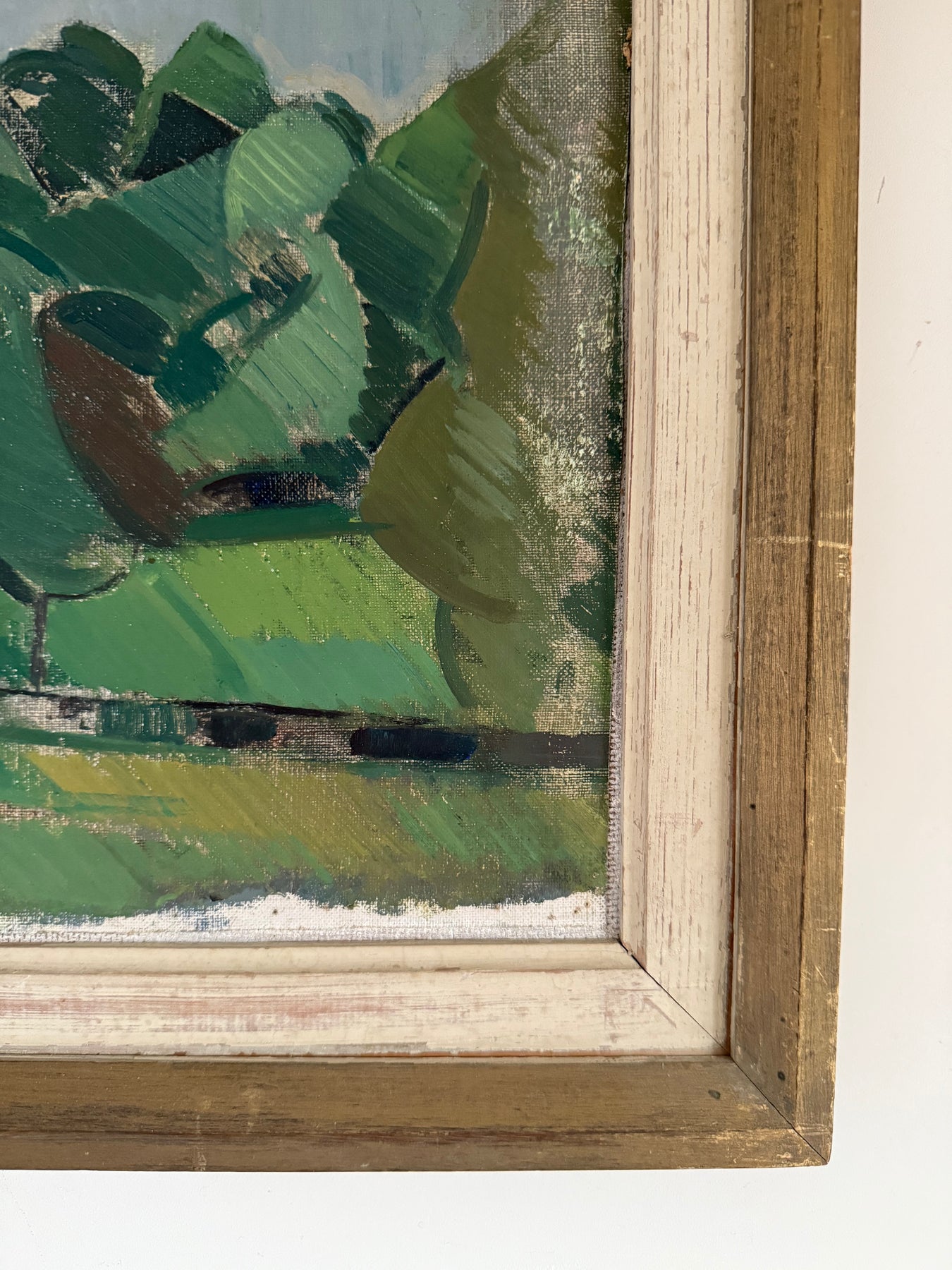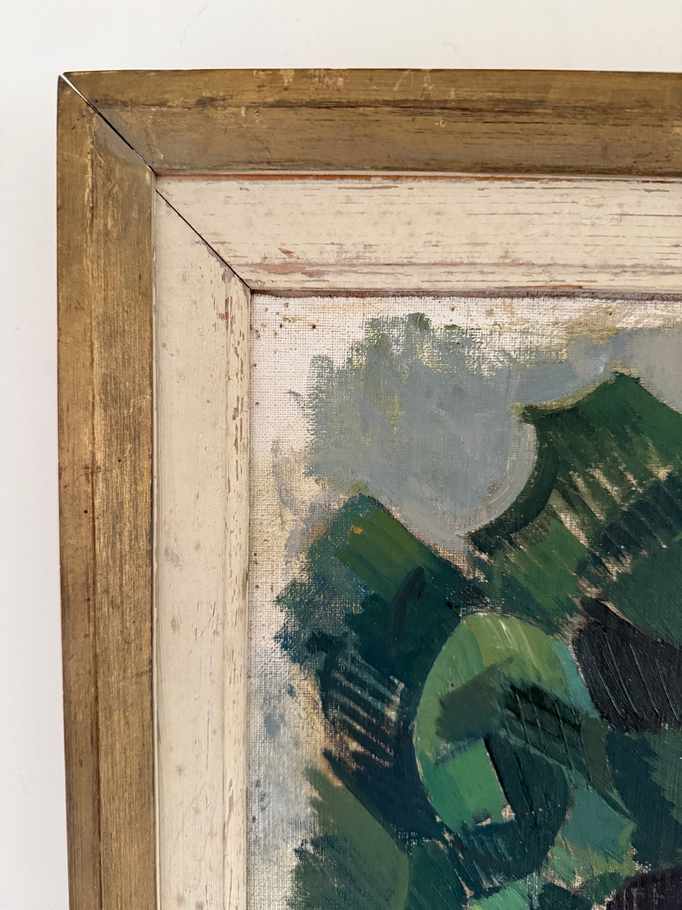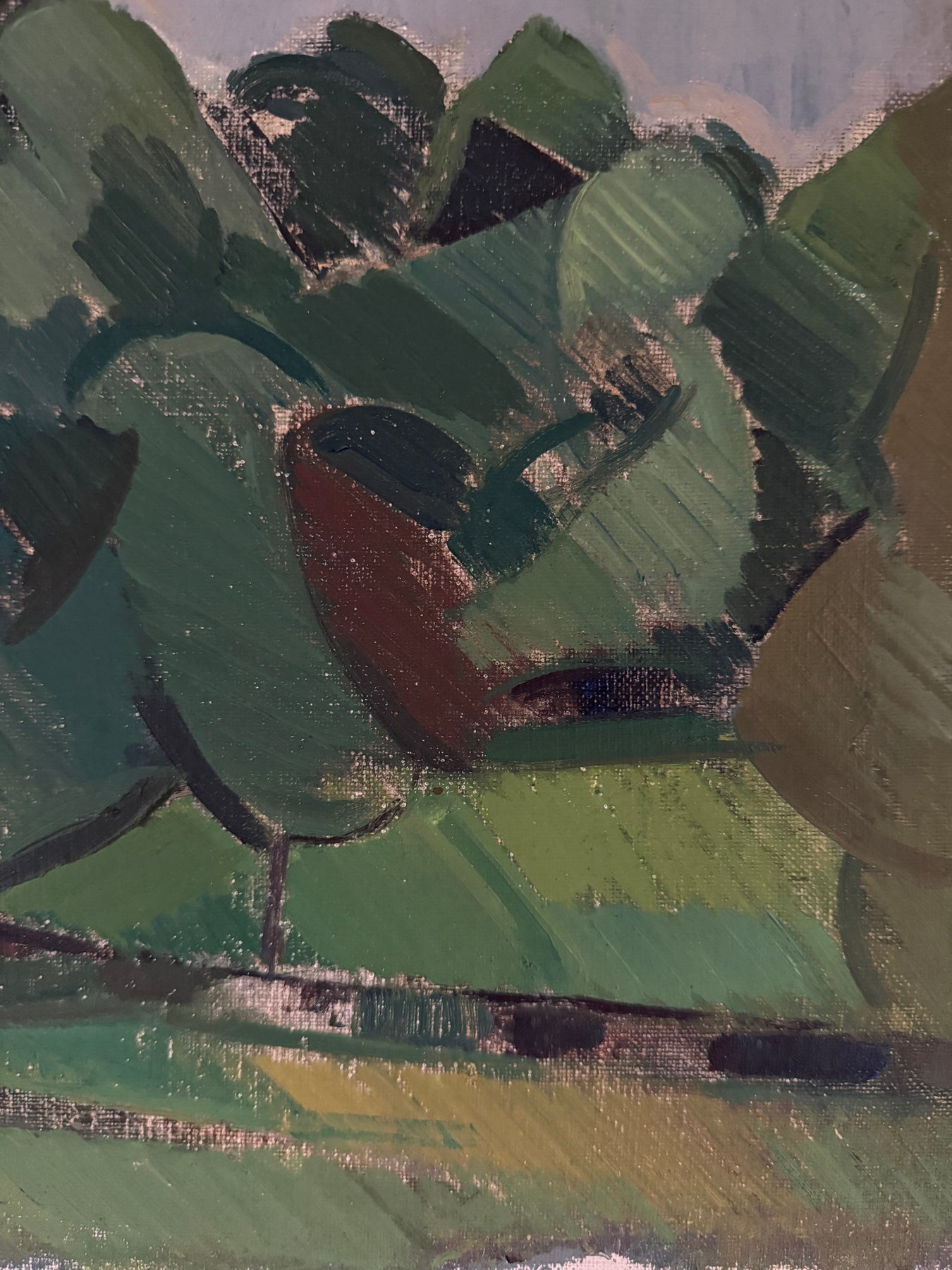 A mid-century oil study of trees and sky, painted in confident blocks of green with a soft, grey backdrop. The brushwork gives the foliage a sculpted feel, and a small white building tucks in at the edge of the treeline—just enough structure to anchor the scene.