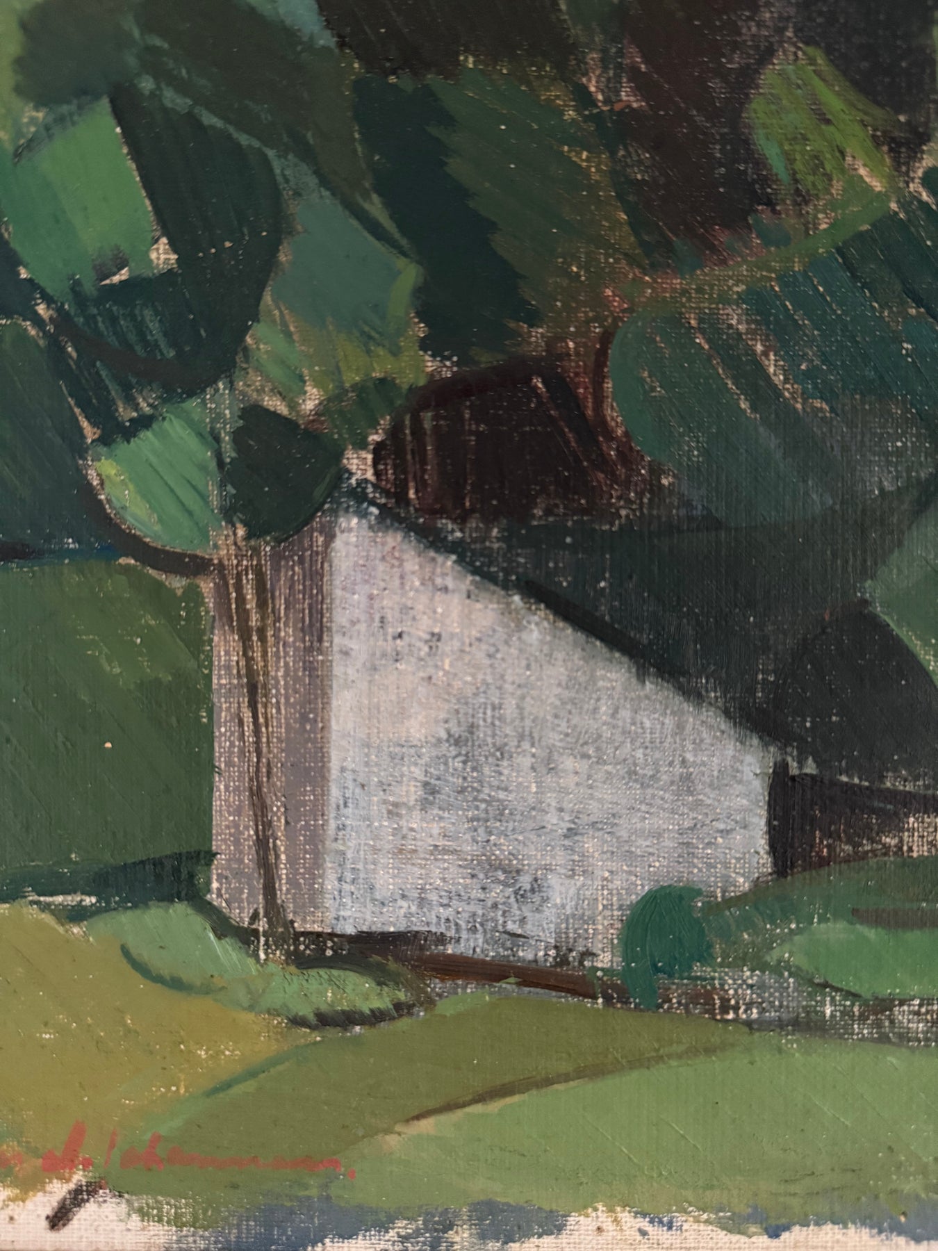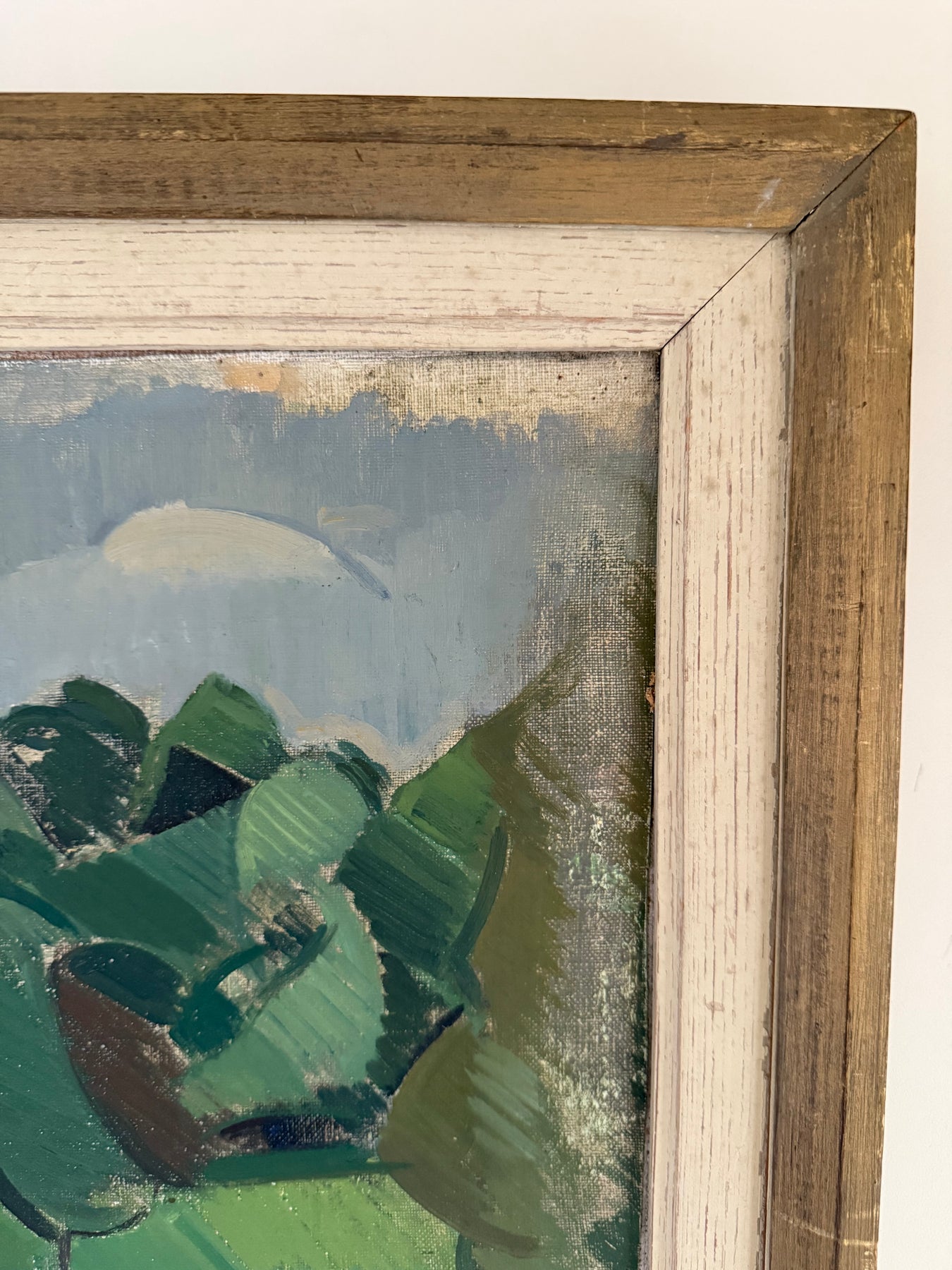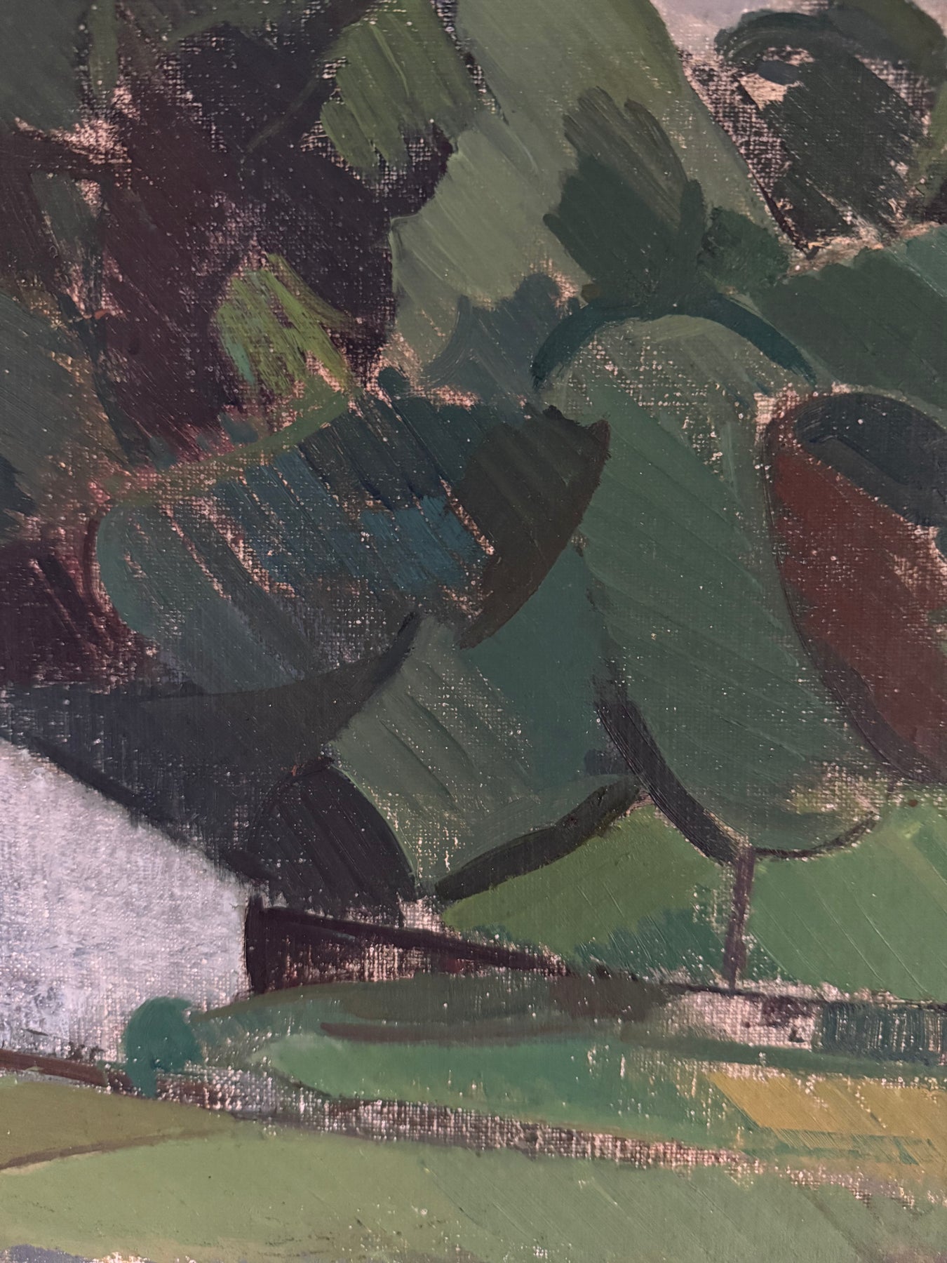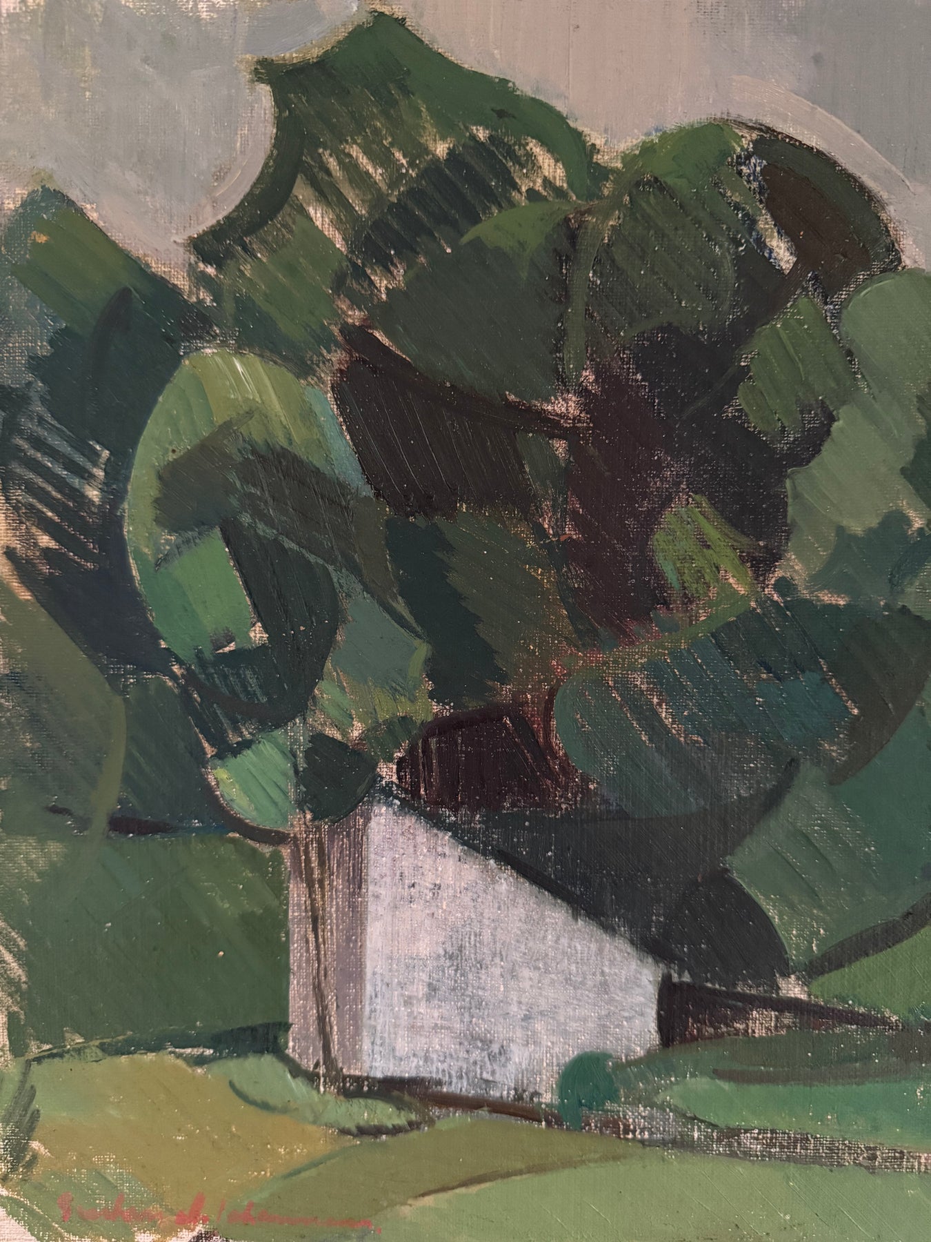 A mid-century oil study of trees and sky, painted in confident blocks of green with a soft, grey backdrop. The brushwork gives the foliage a sculpted feel, and a small white building tucks in at the edge of the treeline—just enough structure to anchor the scene.