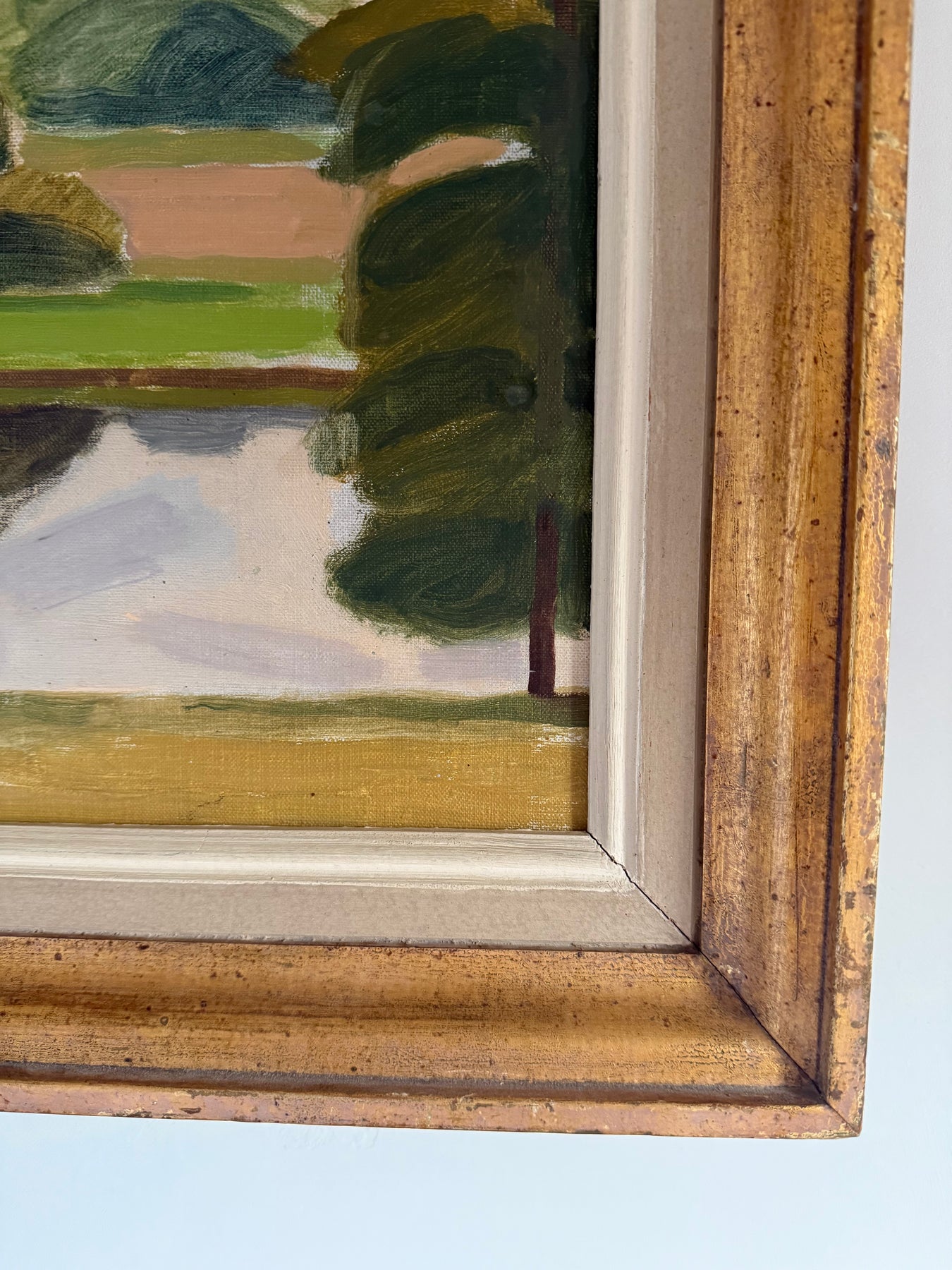 The palette is restrained — moss green, olive, soft blue-grey and warm earth — with visible brushstrokes lending texture and movement. The composition is informal but resolved, likely painted en plein air or from close observation.