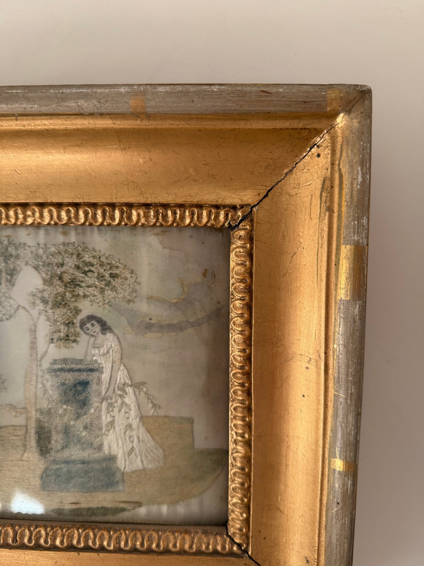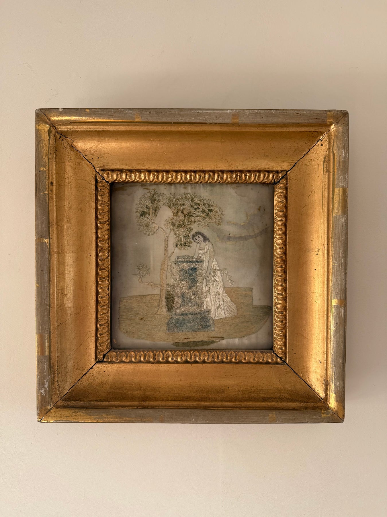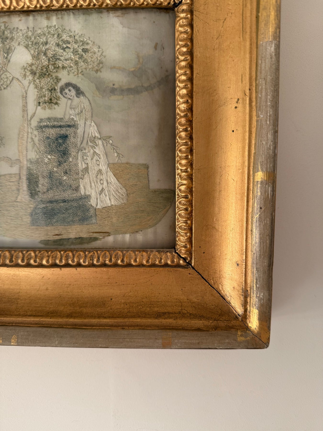 The embroidery is presented in a later gilt wood frame. The reverse shows traditional hand-lacing to a fabric support, consistent with period mounting practices. The palette has softened over time, with areas of fading and surface wear to the silk commensurate with age, contributing to the timeworn character of the piece.