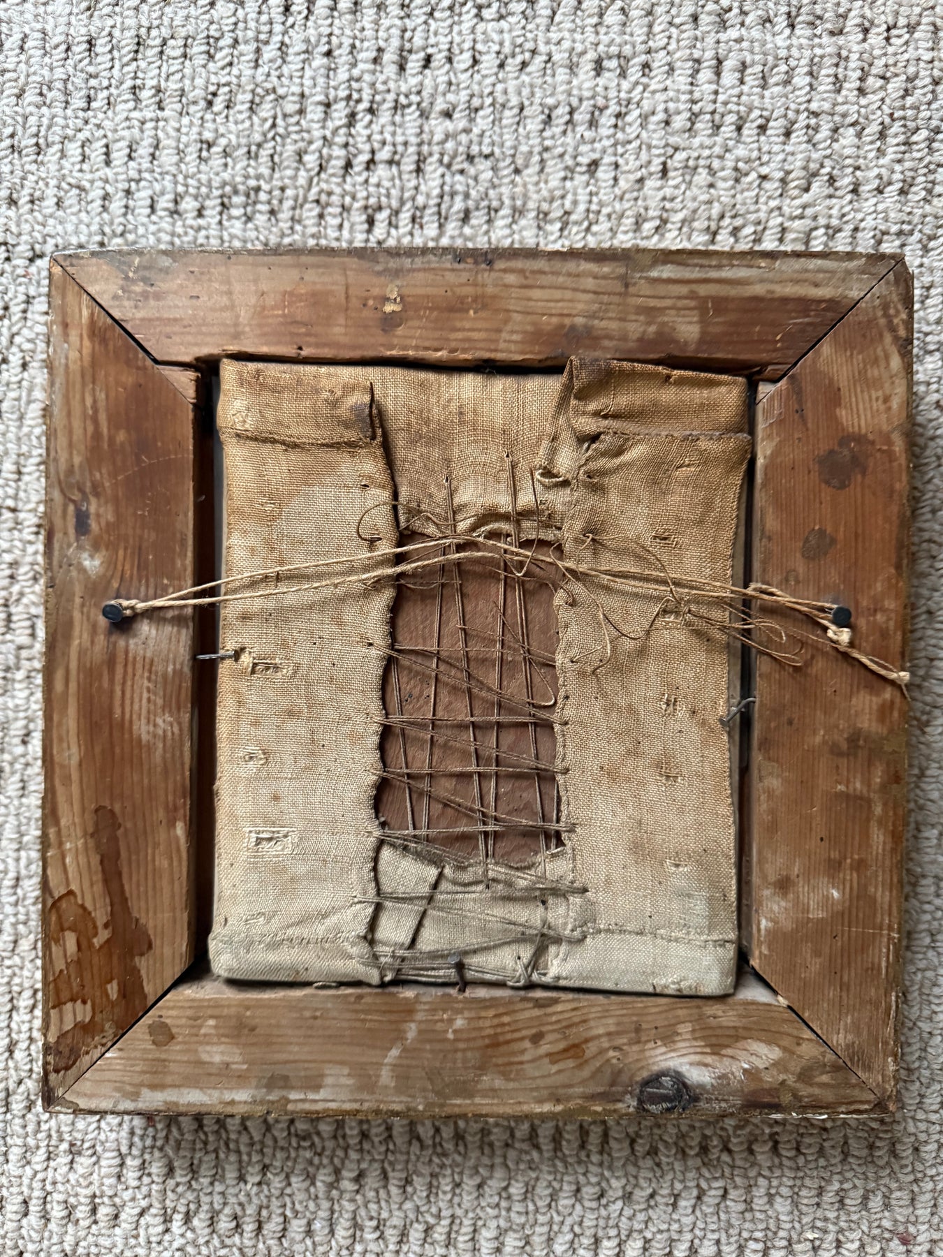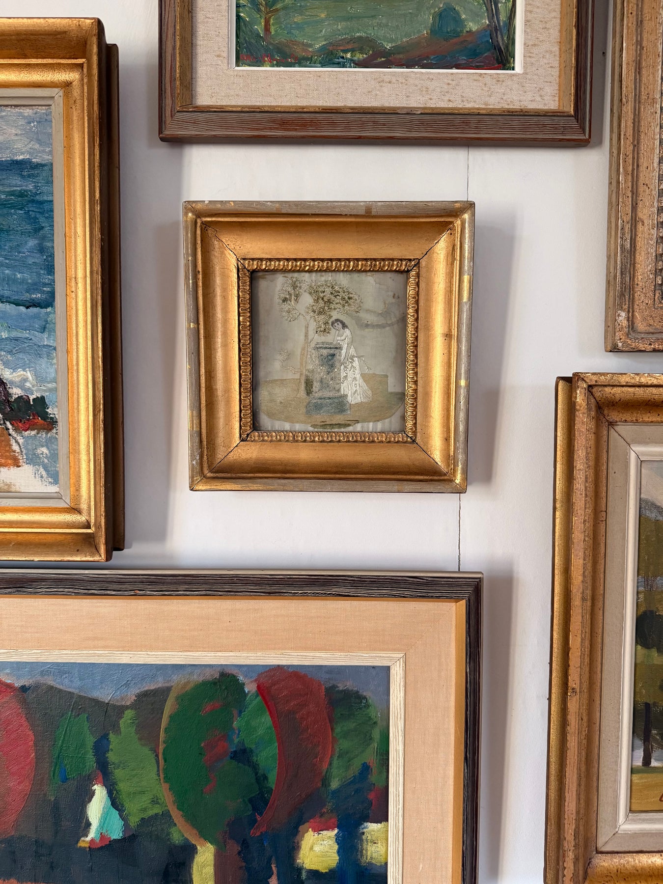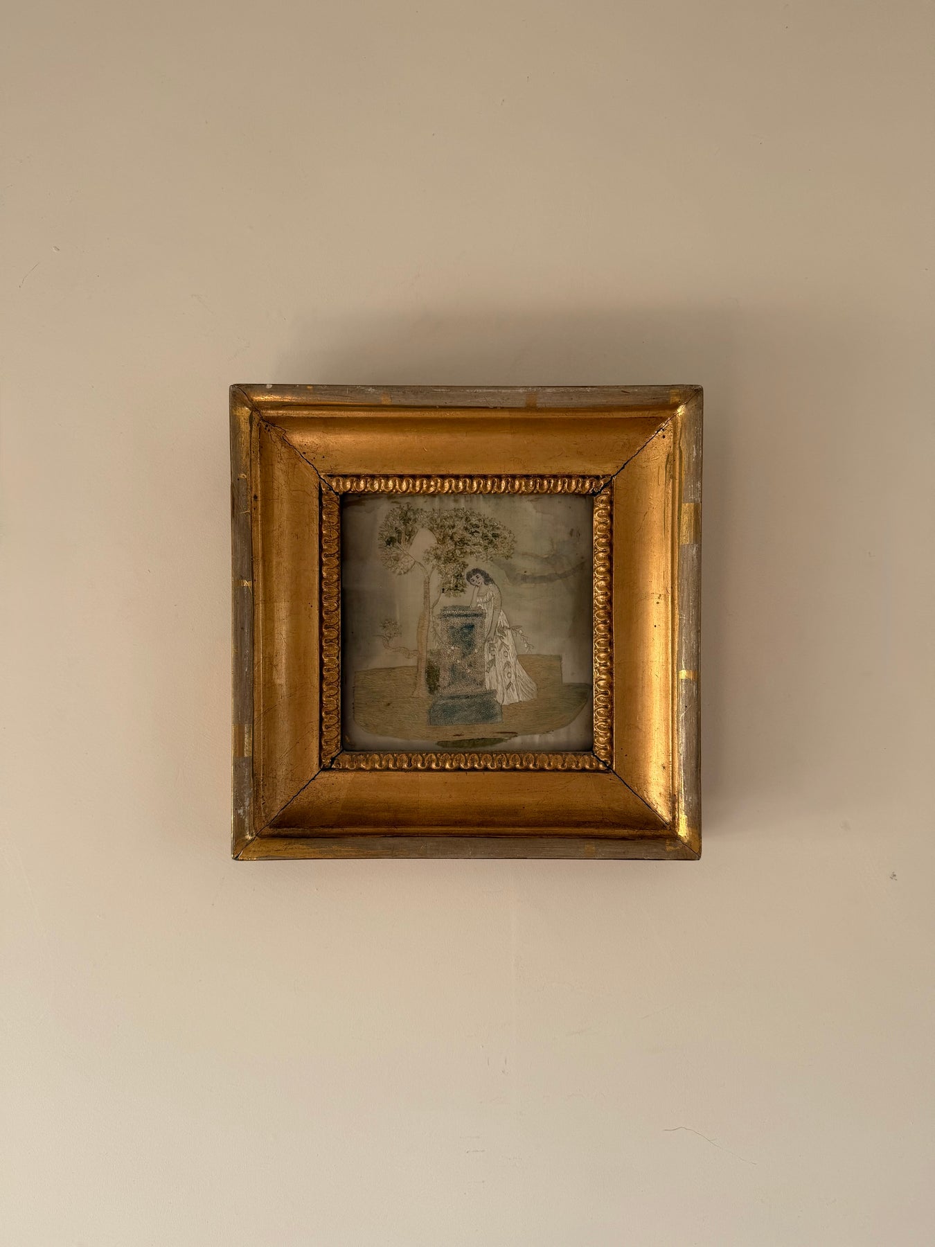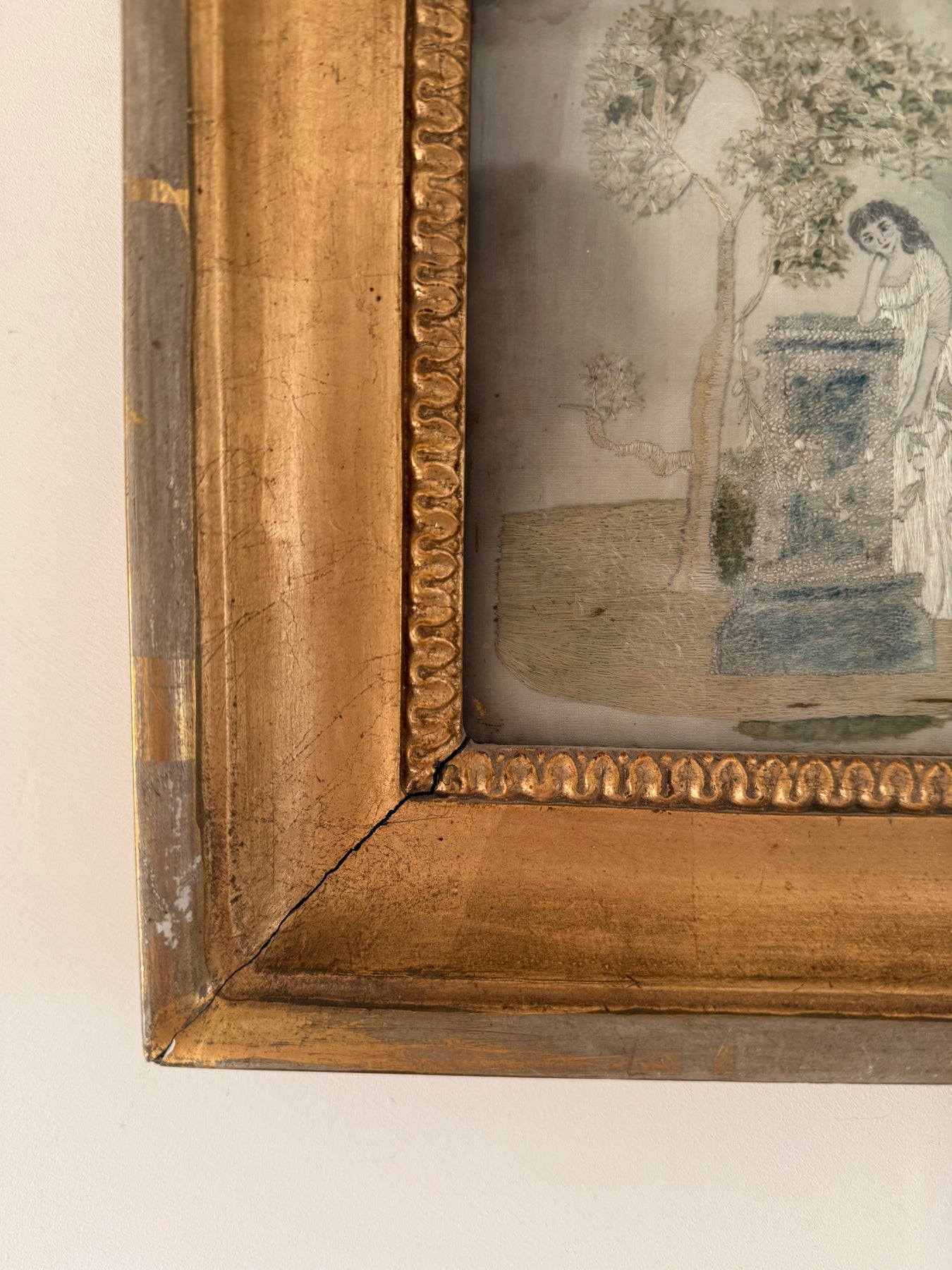 The embroidery is presented in a later gilt wood frame. The reverse shows traditional hand-lacing to a fabric support, consistent with period mounting practices. The palette has softened over time, with areas of fading and surface wear to the silk commensurate with age, contributing to the timeworn character of the piece.