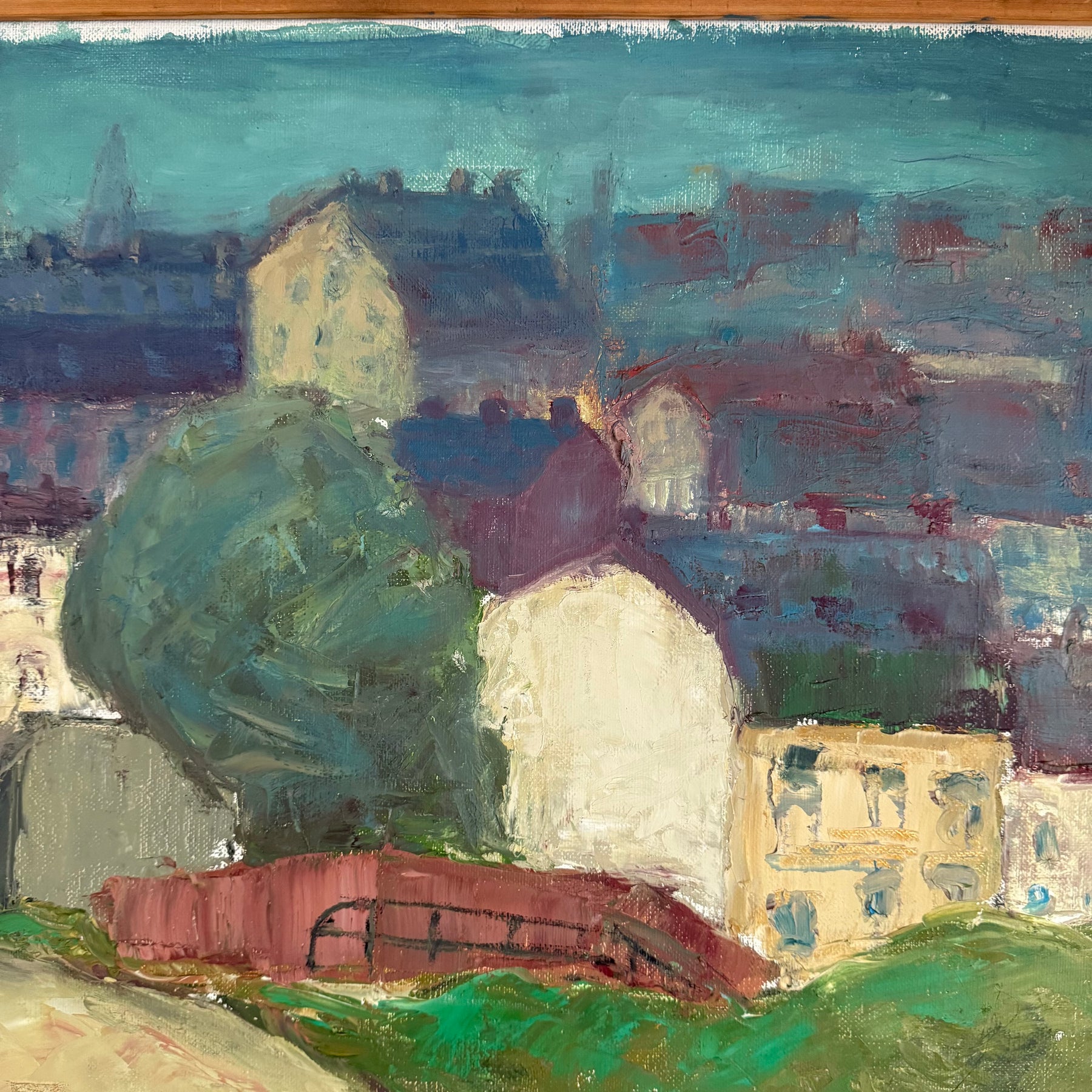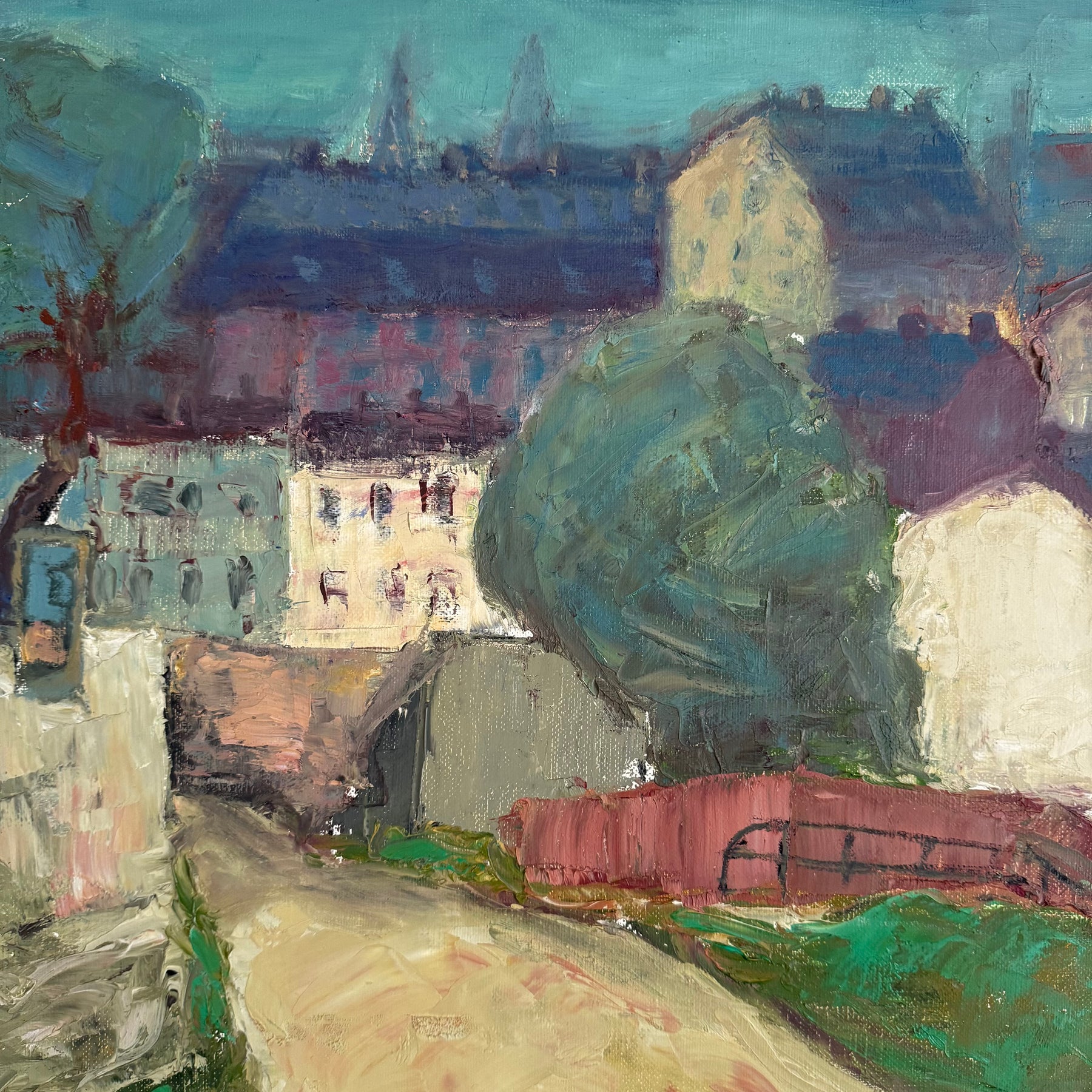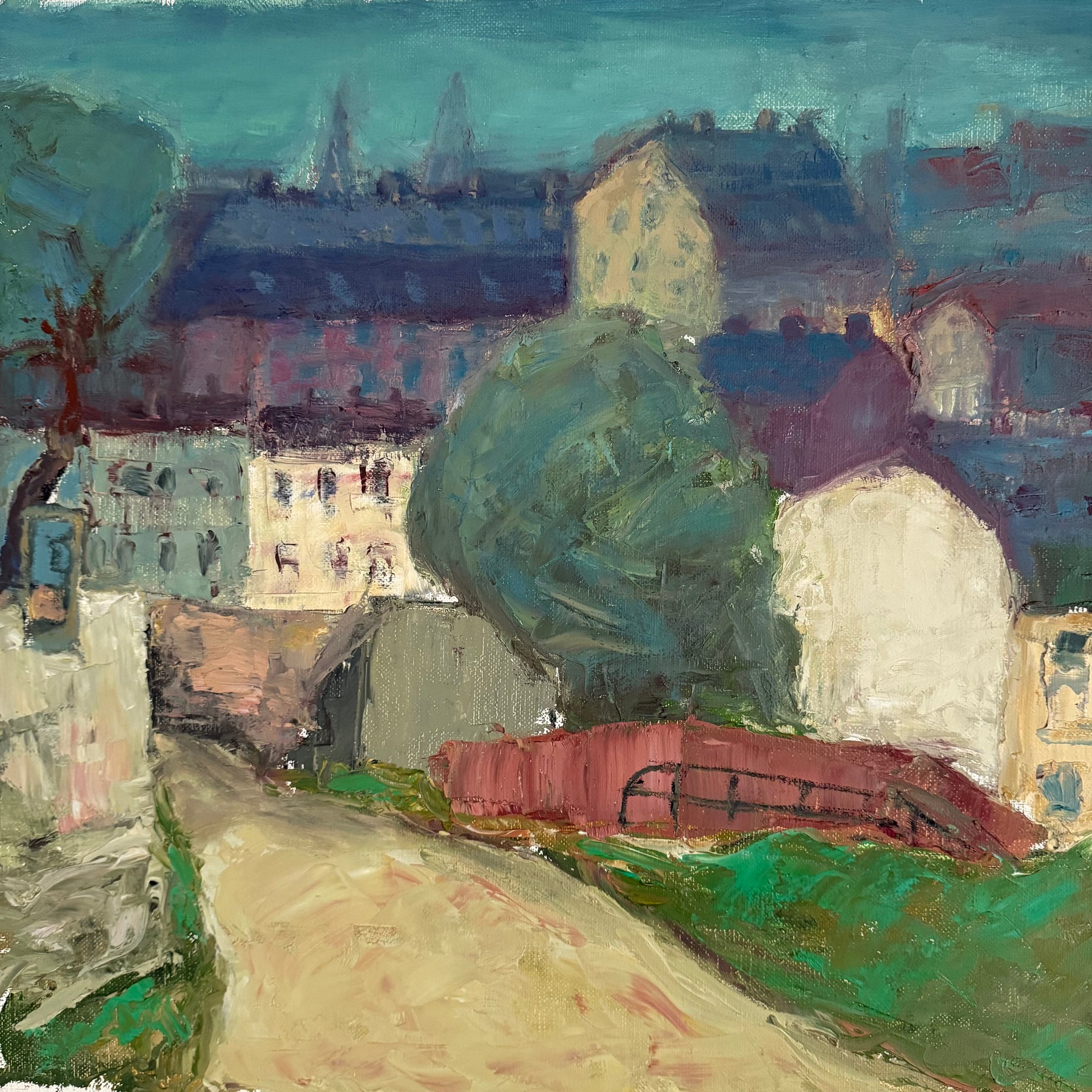 Lovely semi-abstract landscape of a city or town with a bridge and path in the foreground.